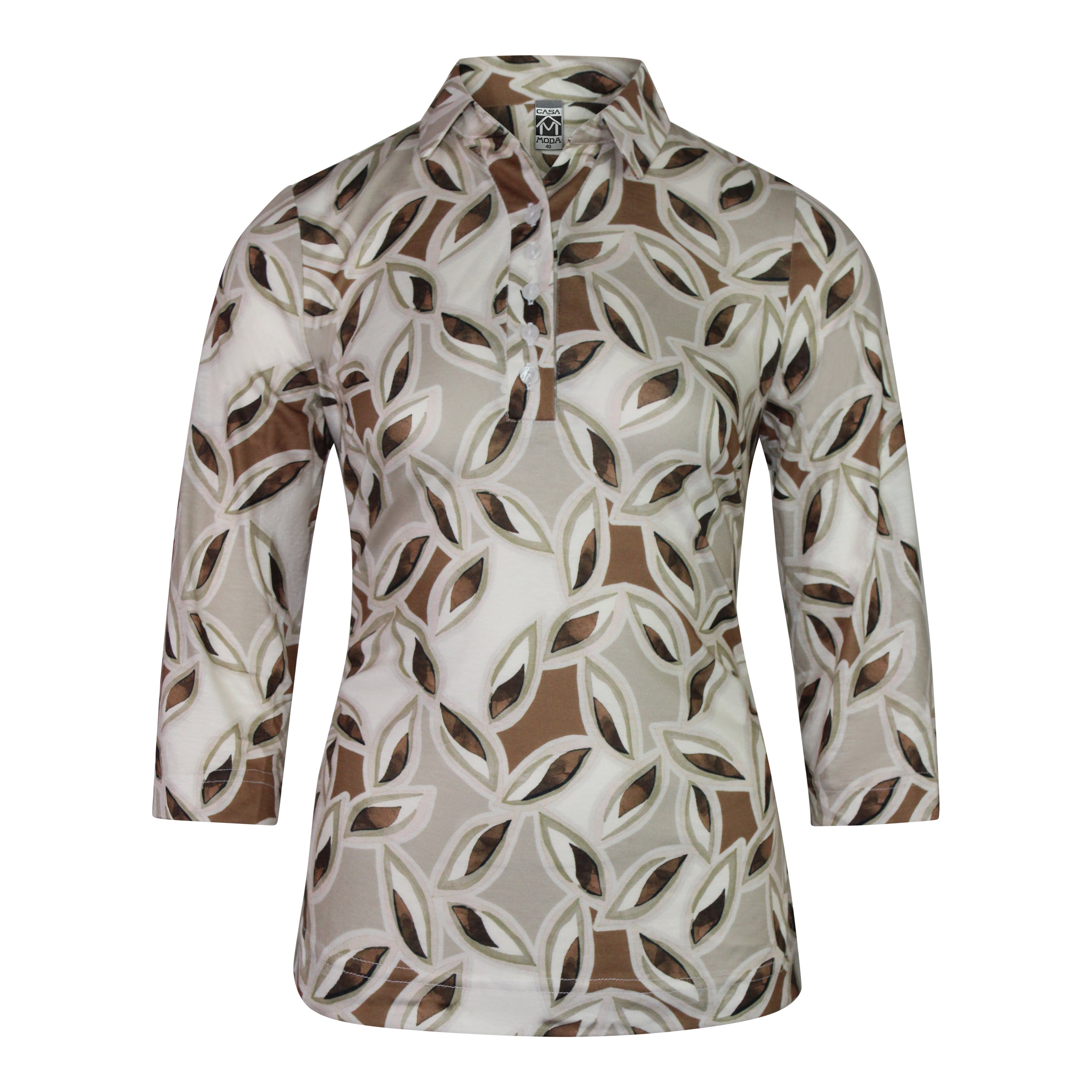 Dit poloshirt is uitgevoerd in een speels bladmotief met een moderne grafische uitstraling. De zachte tinten beige en bruin zorgen voor een rustige, natuurlijke look die makkelijk te combineren is. Het poloshirt heeft comfortabele 3/4 mouwen en een klassieke kraag met bijpassende knoopjes. De zachte stof draagt prettig en maakt dit poloshirt ideaal voor zowel dagelijks gebruik als een geklede look