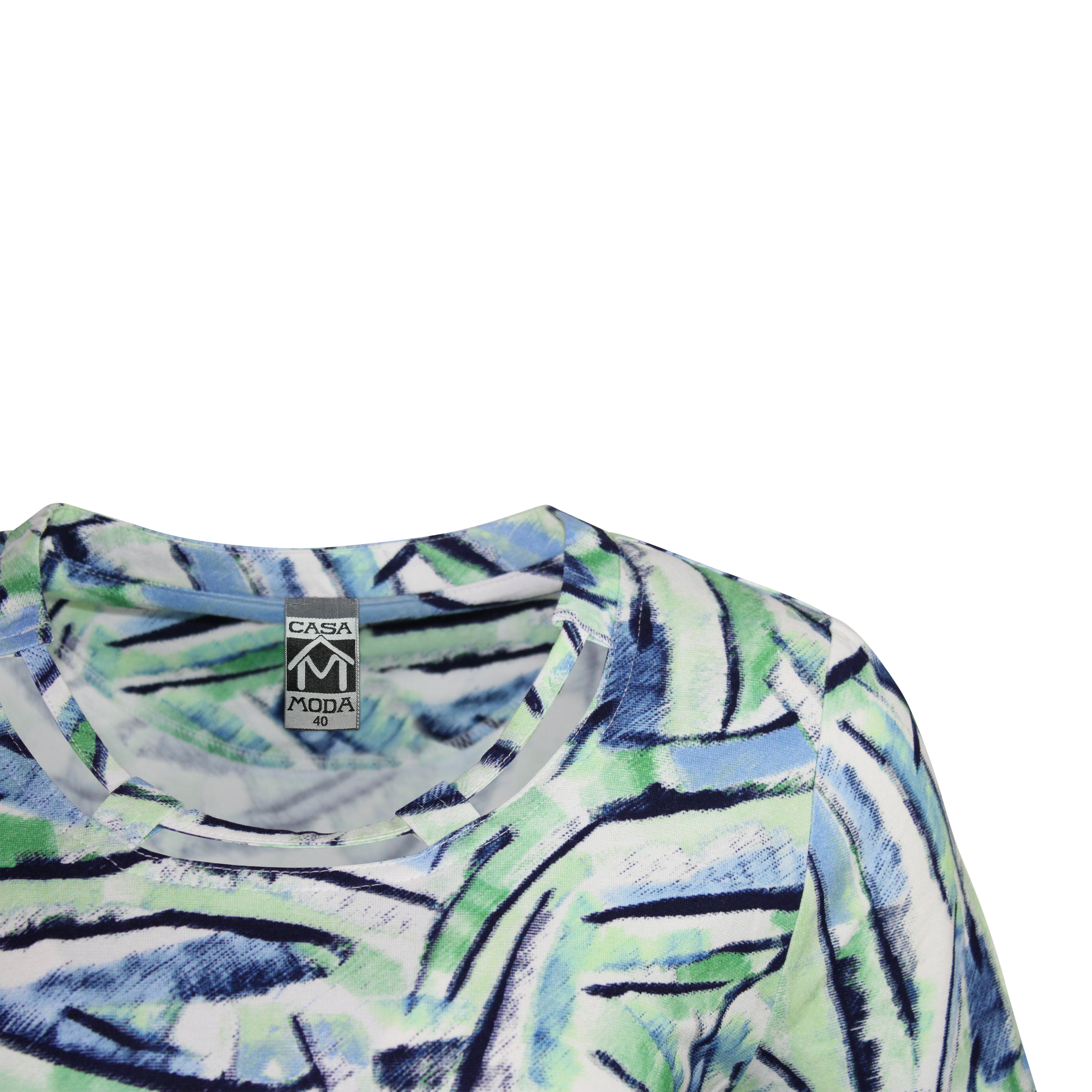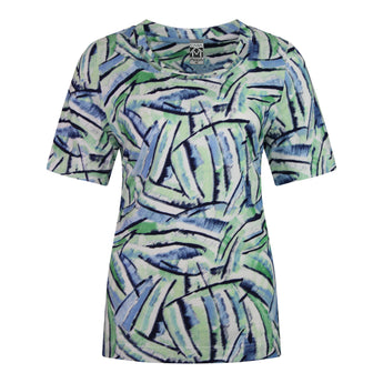 Shirt met brushstroke print in frisse voorjaarstinten van azuurblauw en mint. De opengewerkte ronde halslijn geeft het model een speelse en vrouwelijke touch. Voorzien van korte mouwen en uitgevoerd in een zachte, soepelvallende elastische jersey kwaliteit voor optimaal draagcomfort. Makkelijk te combineren en een echte aanwinst voor je garderobe. Ook verkrijgbaar in een fuchsia tint.