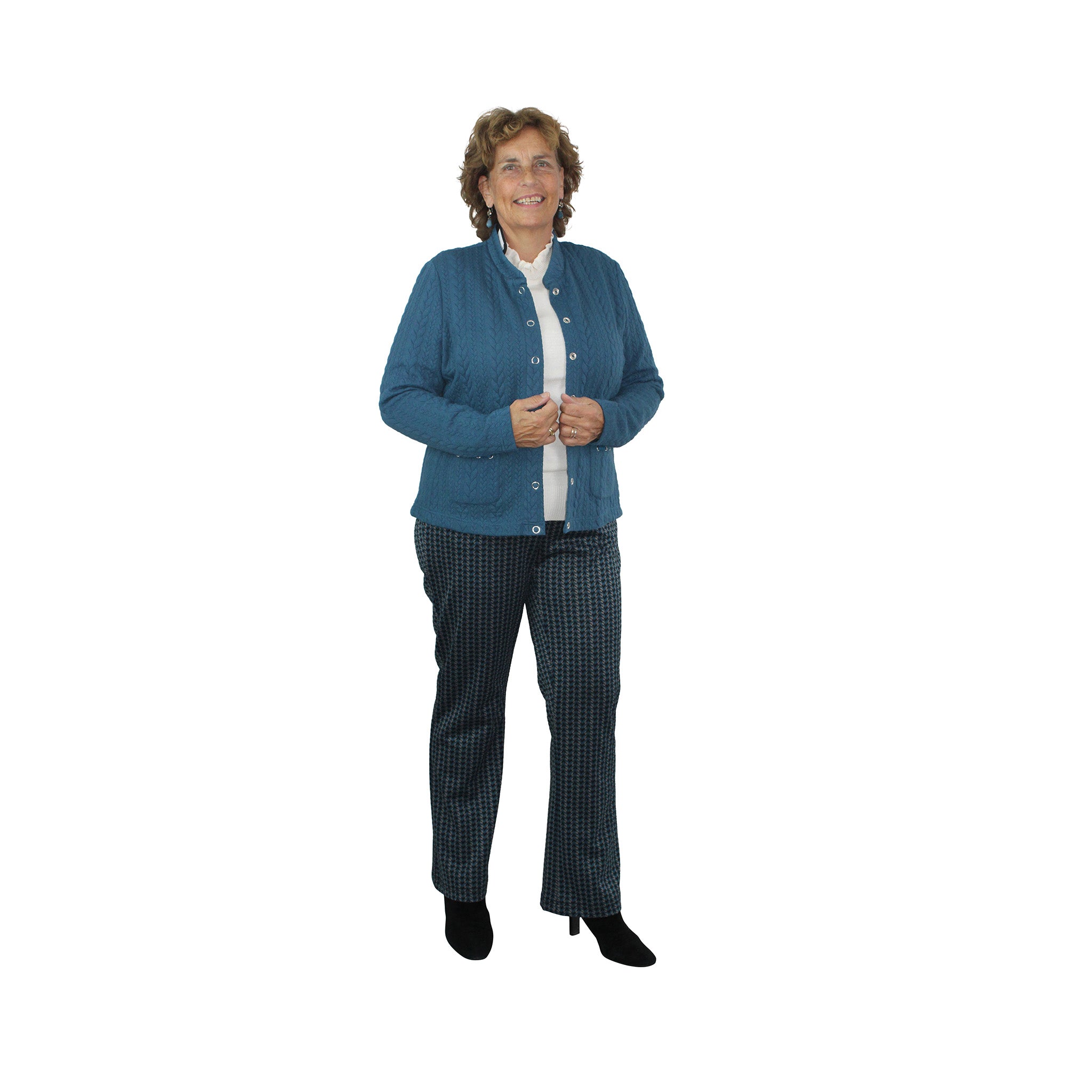 Rijk uitgevoerd vestjasje in een uni tint met kabelpatroon in de stof. Het vestjasje heeft een opstaand boordje en een sluiting met drukknoopjes. Op het voorpand zijn versierde steekzakjes verwerkt. Het vestjasje heeft een recht model en lange mouwen. Het vestjasje voelt zacht en soepel aan en heeft een optimaal draagcomfort.
