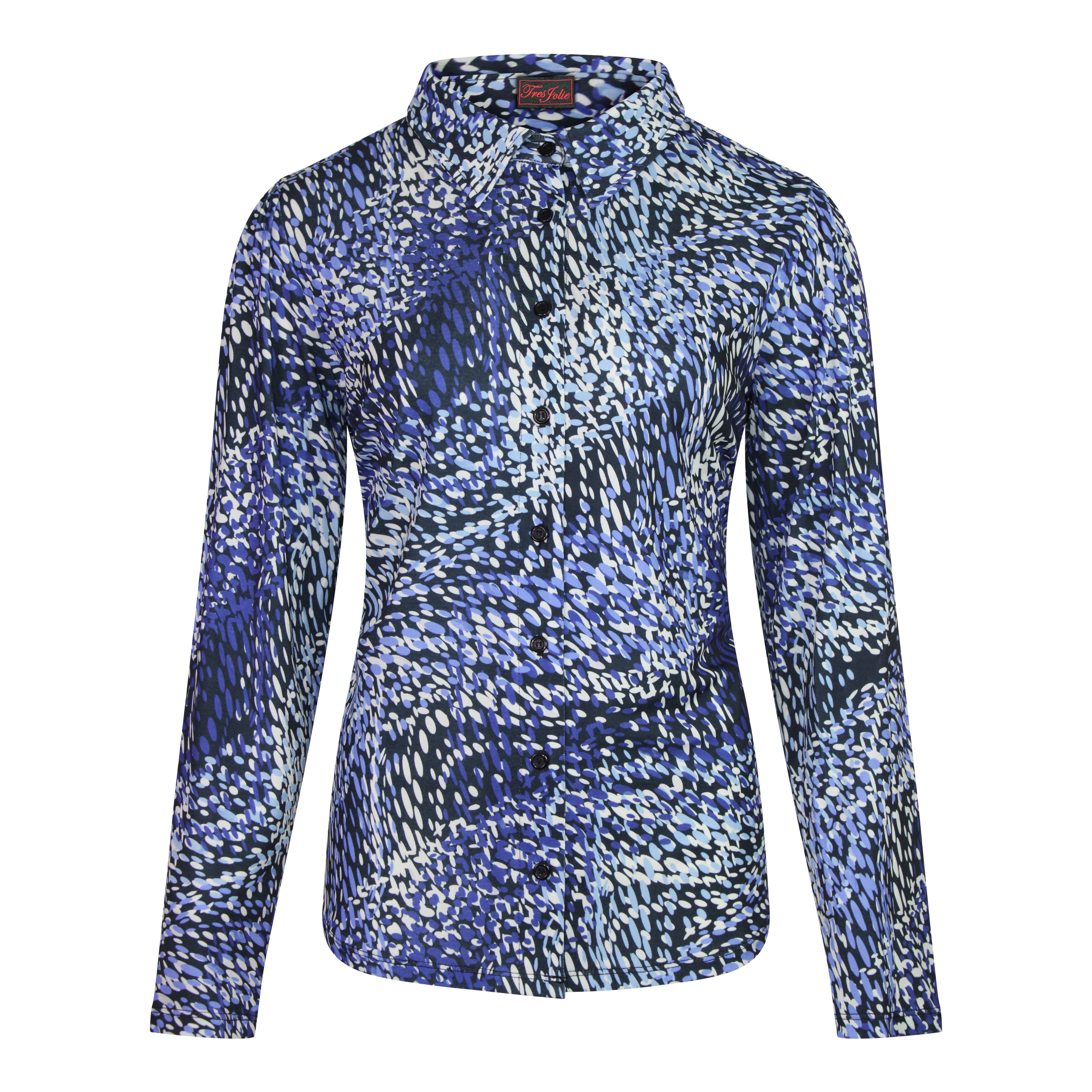 Deze casual blouse in een travel kwaliteit met lange mouwen is een echte blikvanger!  De blouse heeft een all over dessin en is uitgevoerd in een frisse cobalt kleur. De combinatie van de print en de kleur zorgt voor een vrolijke uitstraling. De blouse is voorzien van een ruime kraag en knoopsluiting en voelt soepel en zacht aan.