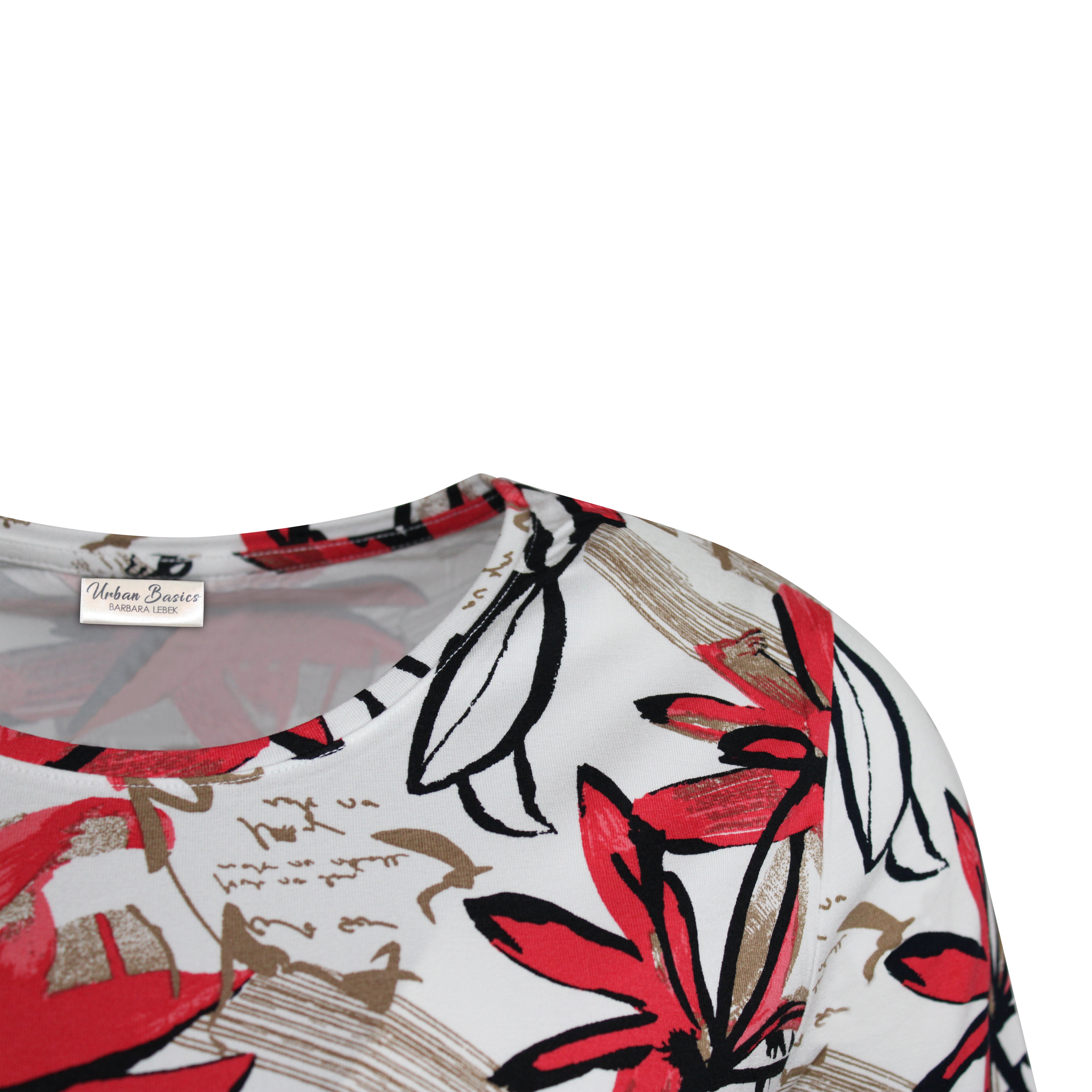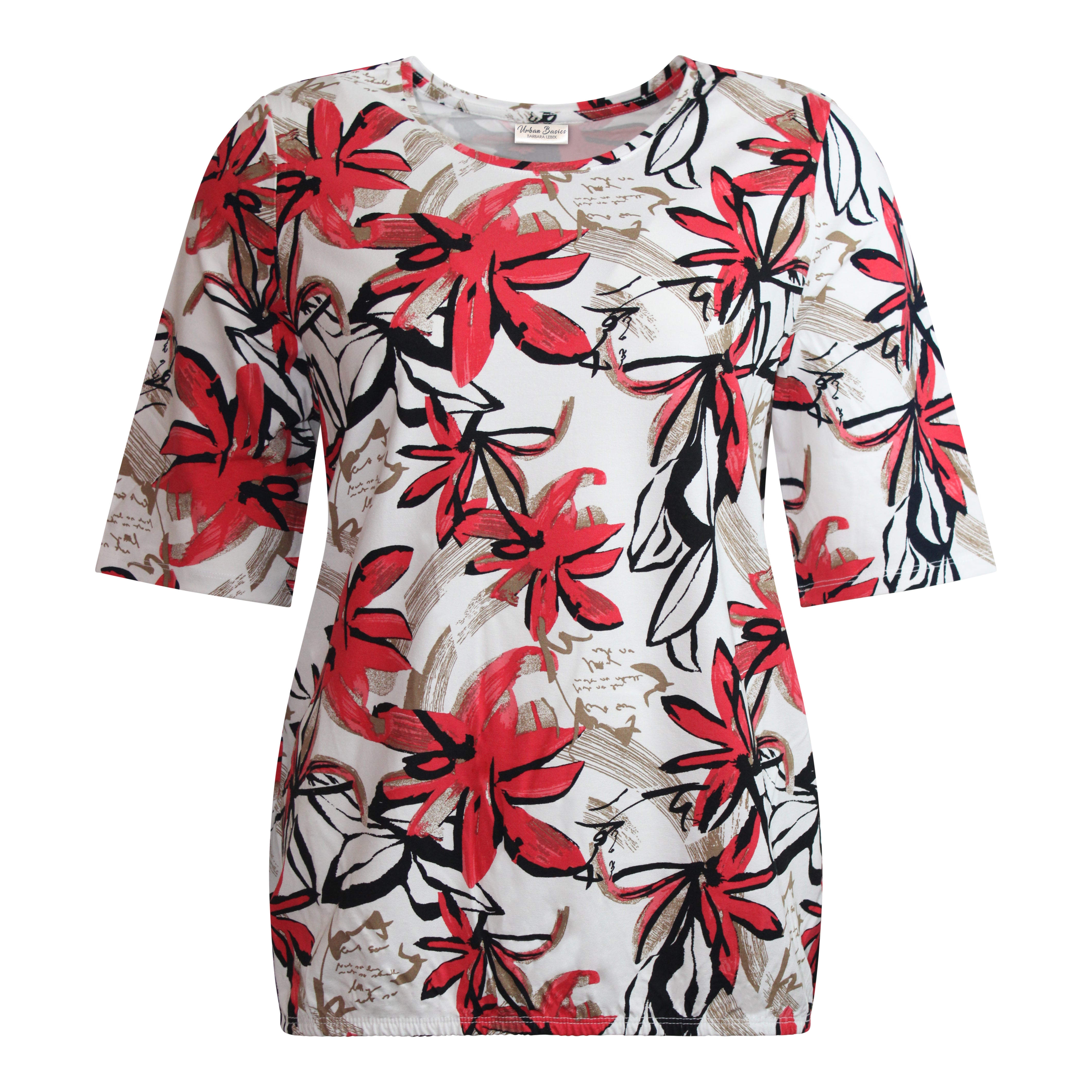 Fleurige blouson met een opvallend bloemmotief in rood- en zwarttinten op een witte ondergrond. De ronde halslijn en korte mouwen zorgen voor een frisse, vrouwelijke uitstraling. Gemaakt van een elastische viscosekwaliteit die heerlijk zacht aanvoelt op de huid en zorgt voor een mooie pasvorm. Een echte eyecatcher voor elke outfit.
