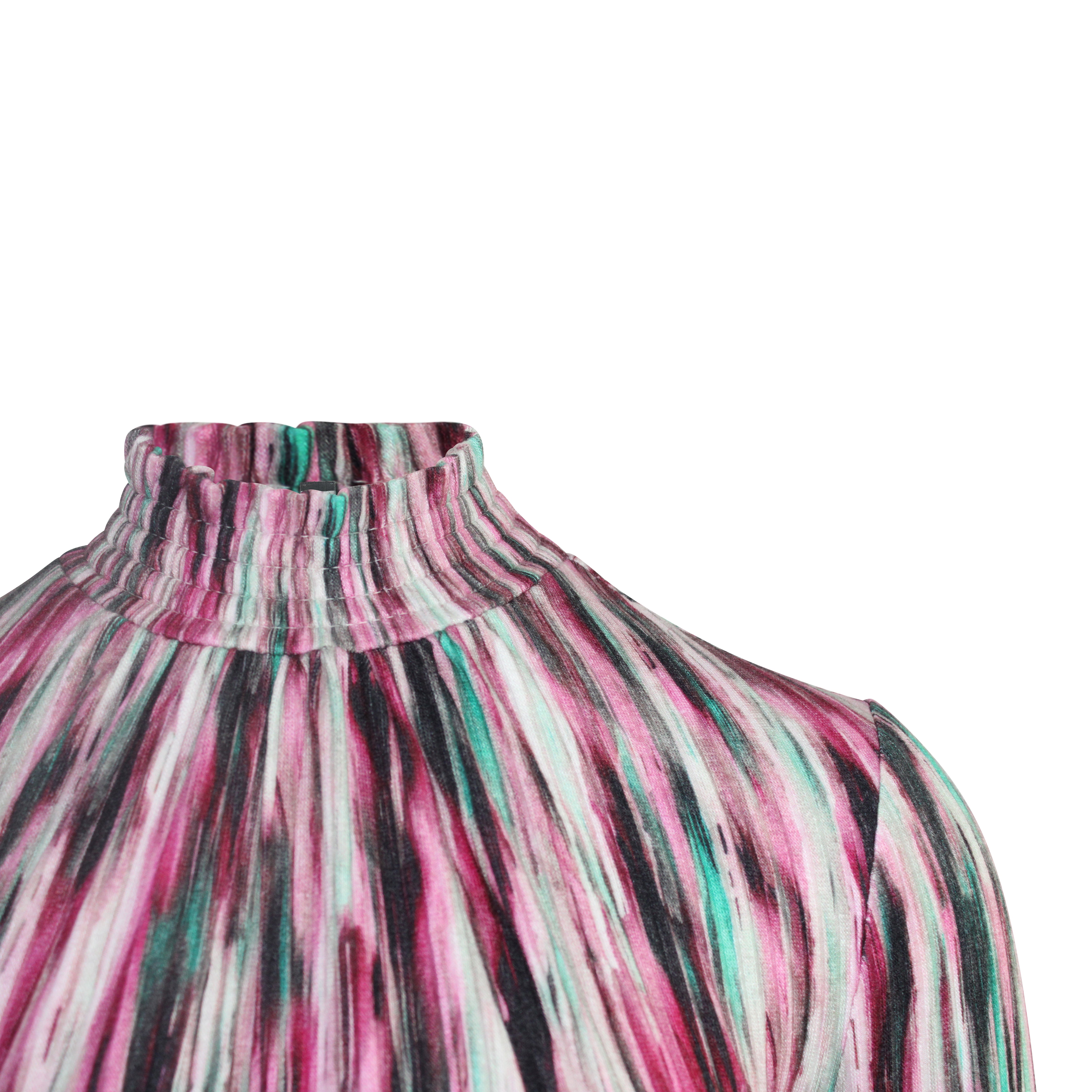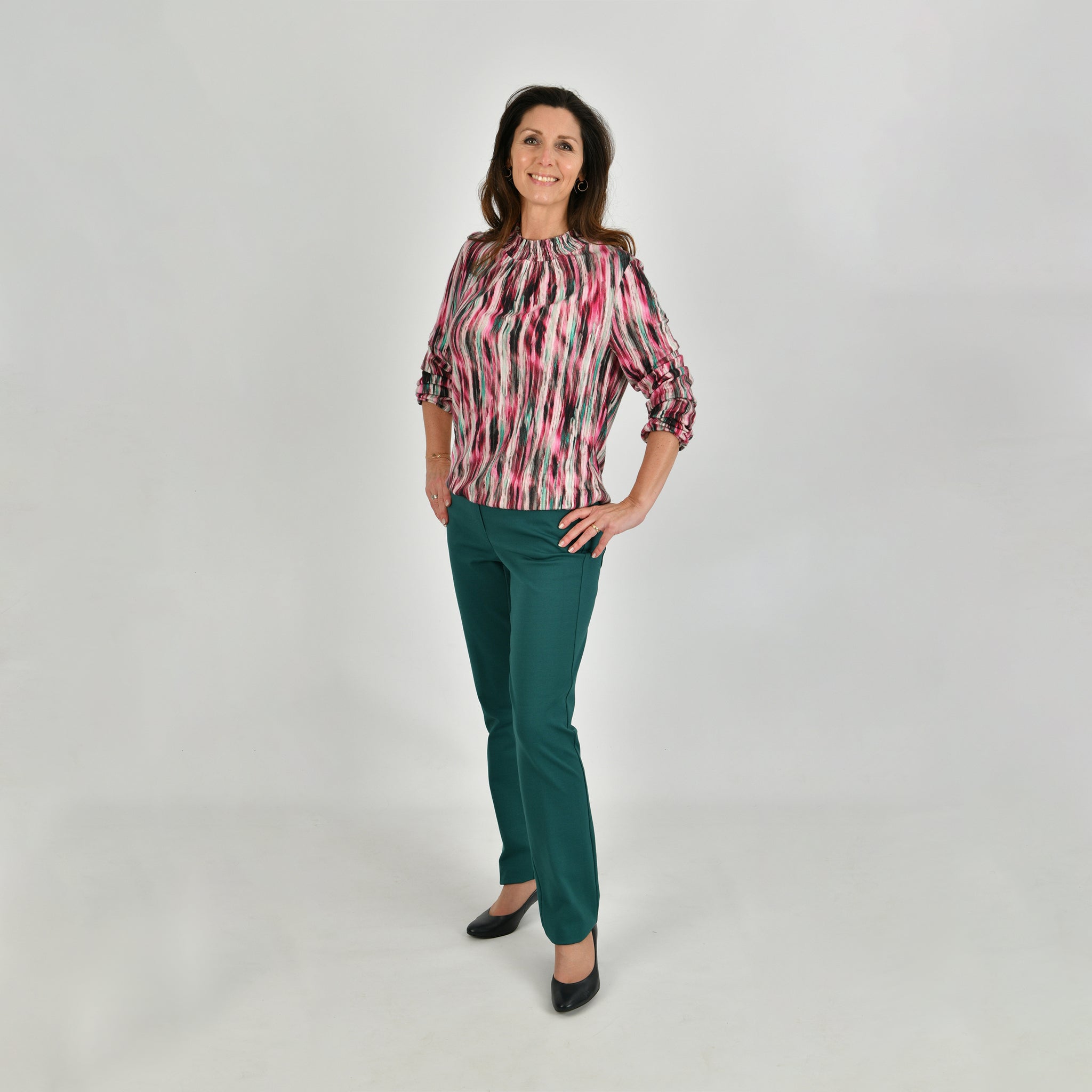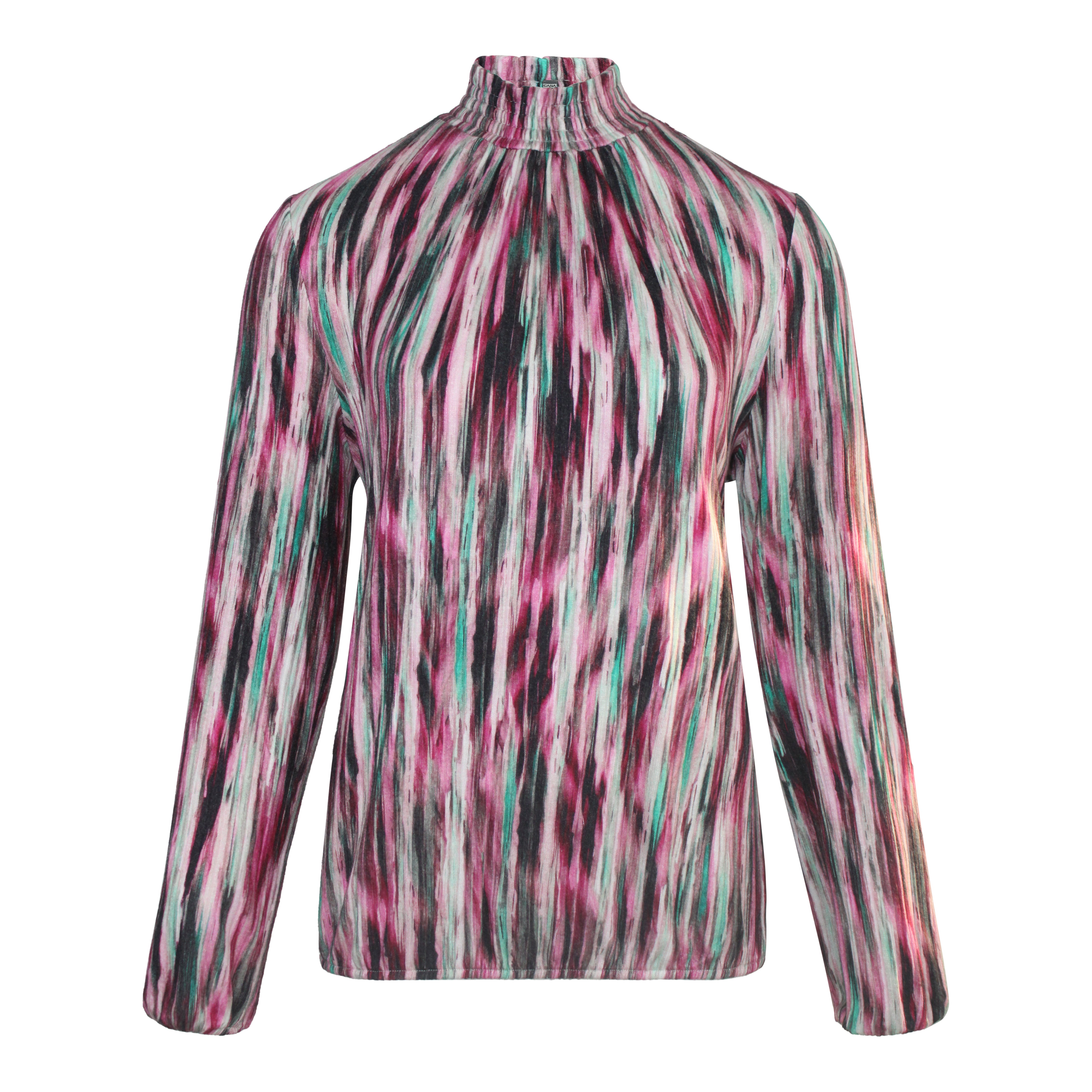 Casual blouson in een streepdessin met opstaand geschubd boordje en lange mouwen. De blouson voelt heerlijk zacht aan wat zorgt voor een optimaal draagcomfort. De blouson heeft een recht model en een all over dessin. In de zoom is dun elastiek verwerkt.