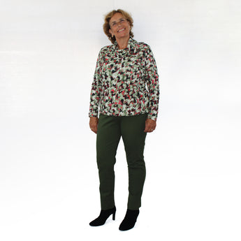 Casual blouson met een opvallende abstracte camouflageprint. De blouson heeft een hangcol welke versiert is met een ritsje. In de zoom is een rand elastiek verwerkt, wat zorgt voor een licht blousend effect. De blouson voelt zacht en soepel aan en is gemaakt van een jersey kwaliteit