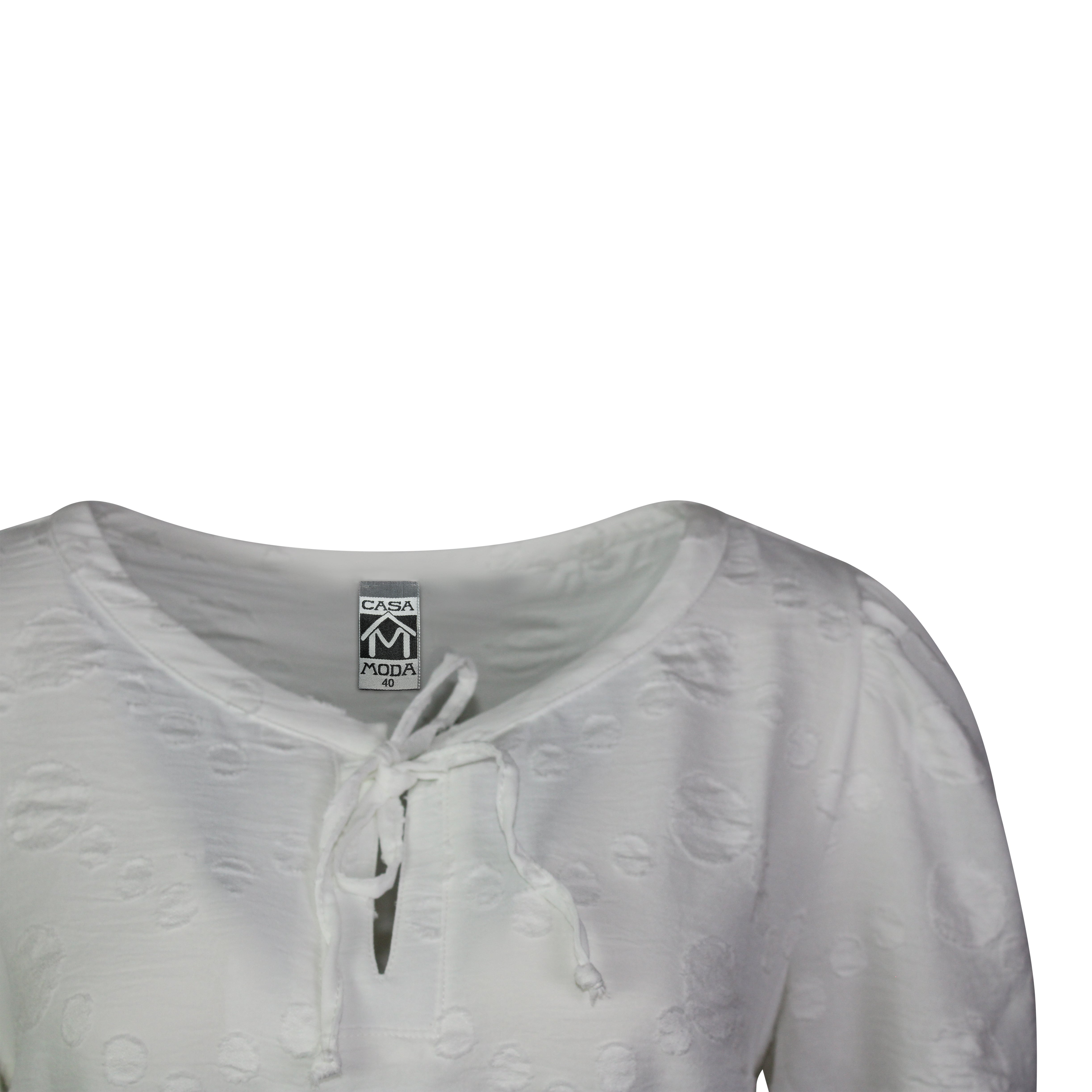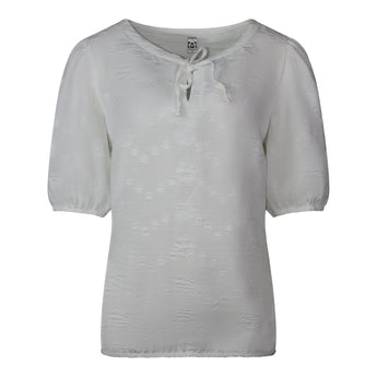 Deze uni blouson in een zachte gebroken witte kleur is een echte allrounder voor elke garderobe. De ronde halslijn met een elegant splitje aan de voorzijde - afgewerkt met een decoratief touwtje - zorgt voor een speels en vrouwelijk detail.