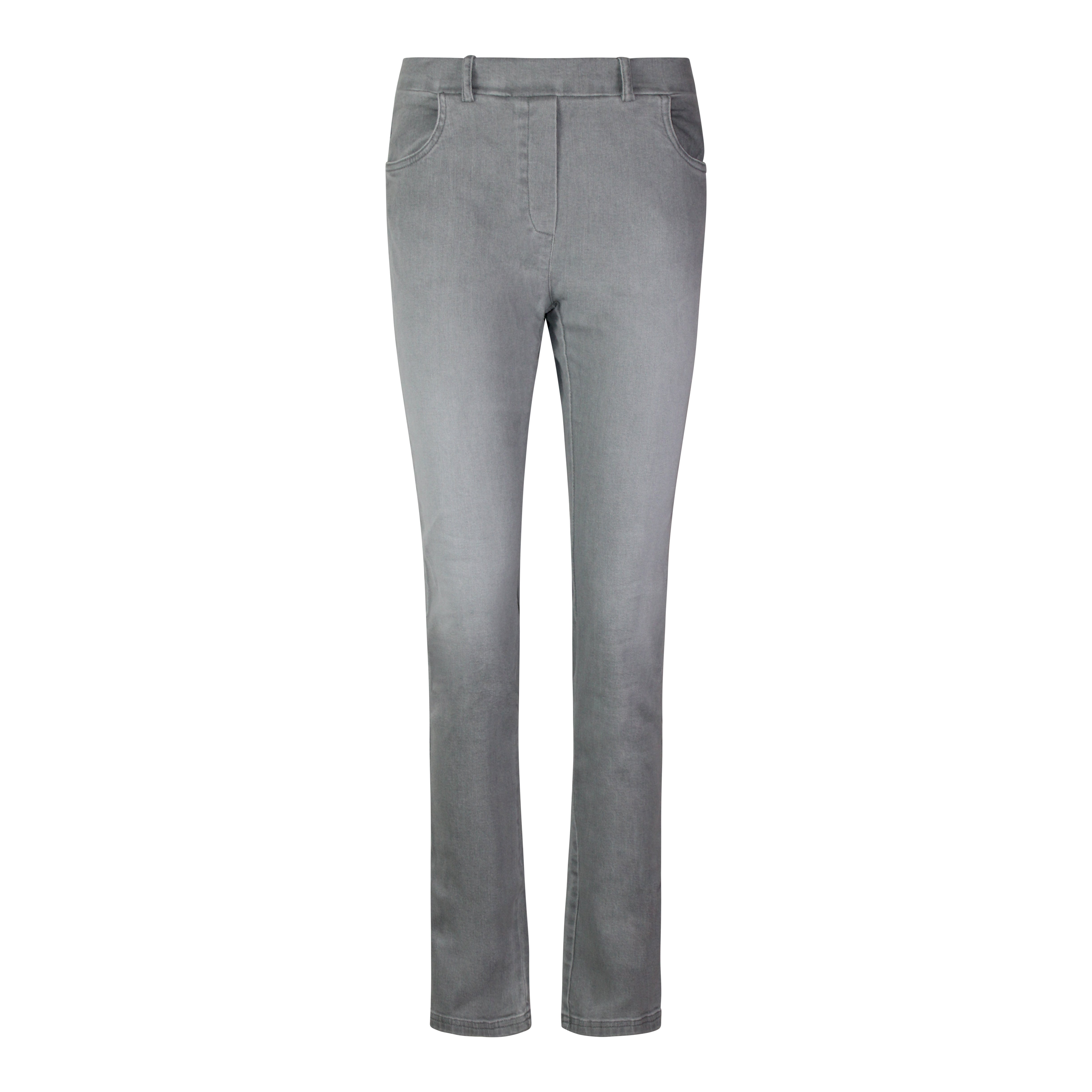 Deze lichtgrijze jeans met elastische tailleband met riemlusjes en zonder sluiting heeft een moderne look en voelt heerlijk aan dankzij de zachte katoenkwaliteit. Makkelijk te combineren voor een moeiteloos eigentijdse uitstraling.