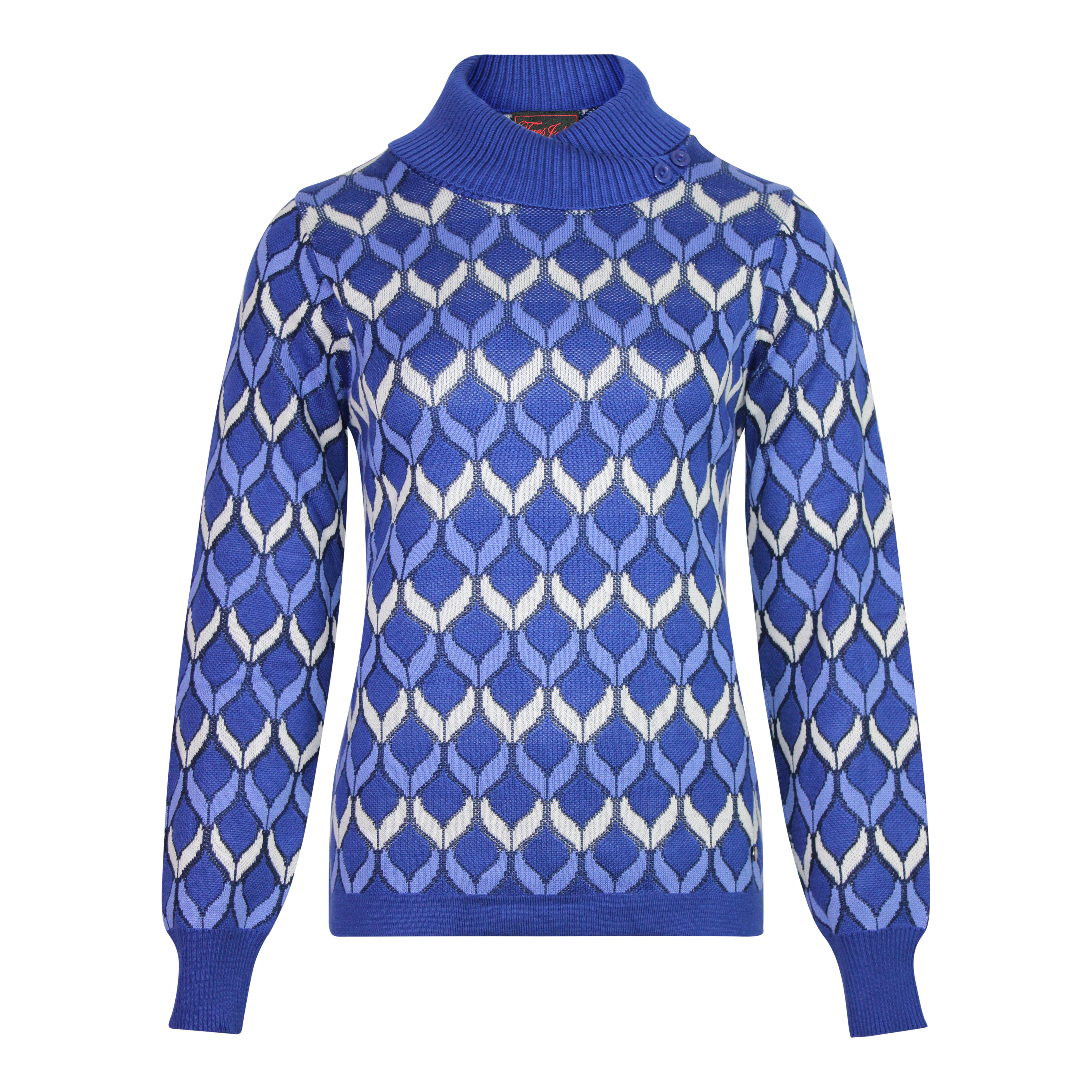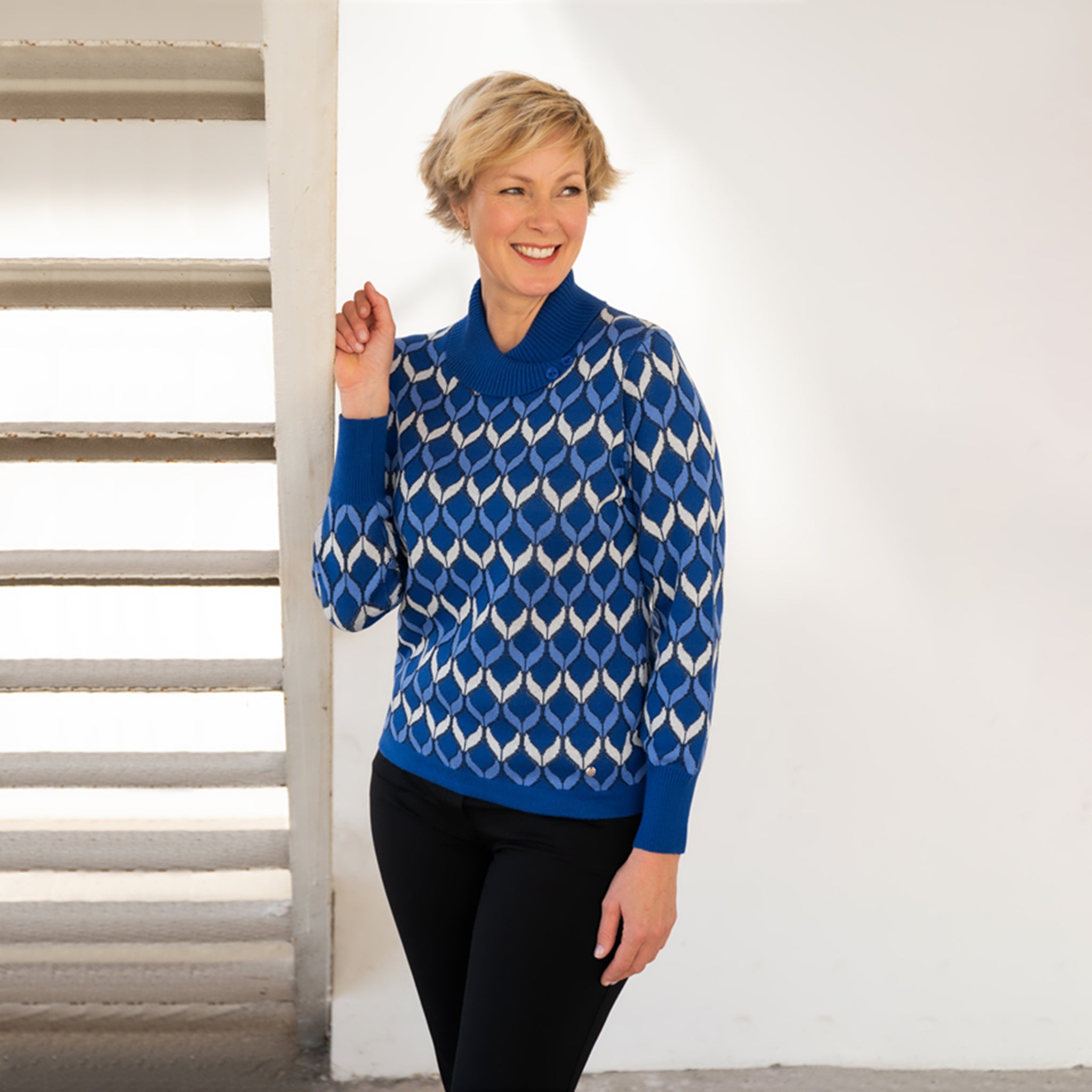 Casual trui in een all over dessin met geometrisch patroon. De trui heeft een ruime platliggende kraag die middenvoor over elkaar heen valt en is versierd met twee knopen. De trui heeft een recht model en lange mouwen. De combinatie van het patroon en de kleuren geven de trui een rijke uitstraling. De trui voelt zacht en soepel aan en heeft een optimaal draagcomfort. Ook verkrijgbaar in de kleur rosberry