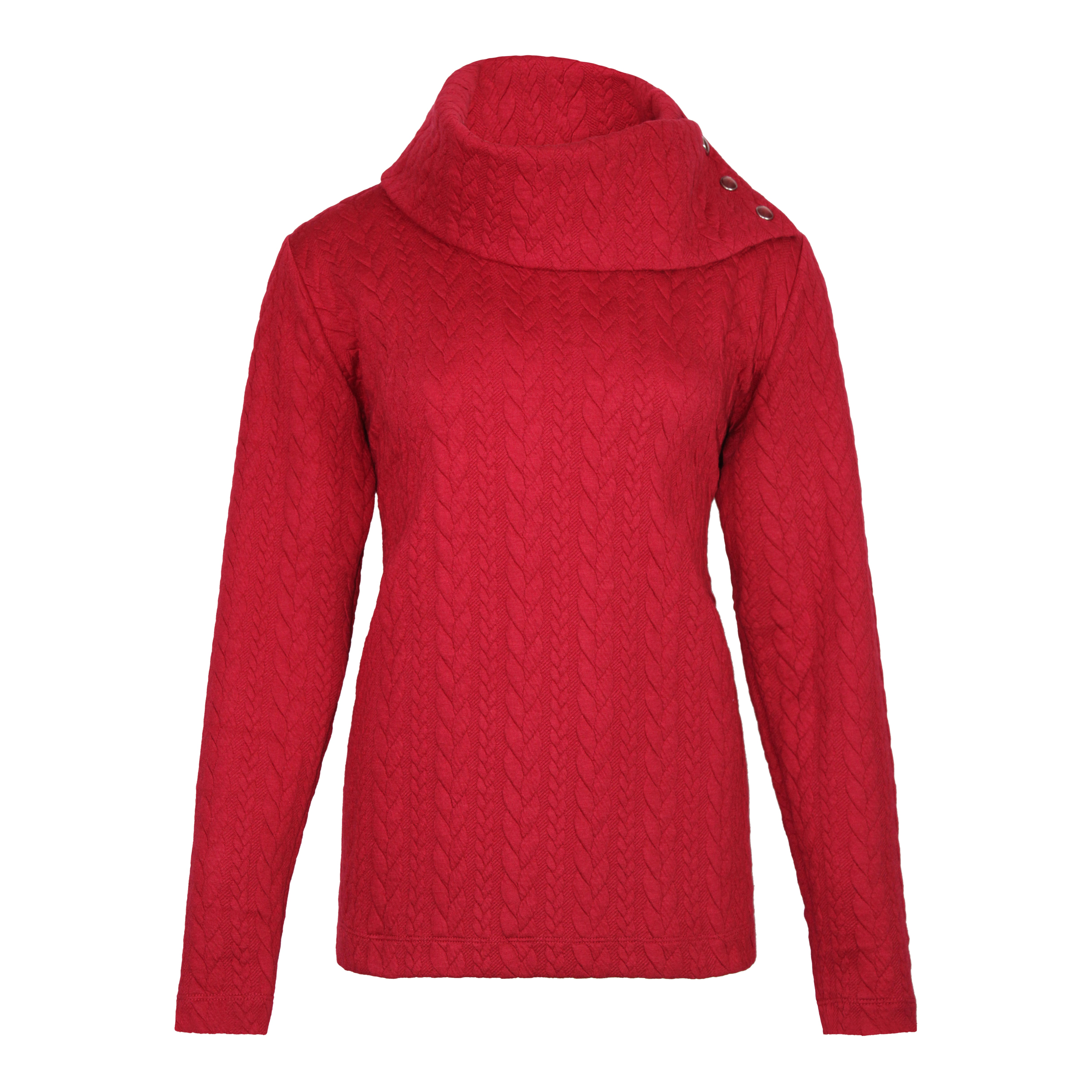 Casual trui in een kabelpatroon uitgevoerd in een frisse rode kleur. De trui heeft een ruime openvallende col welke versierd is met bijpassende knoopjes. De trui is gemaakt van een soepele zachte jersey kwaliteit met optimaal draagcomfort.
