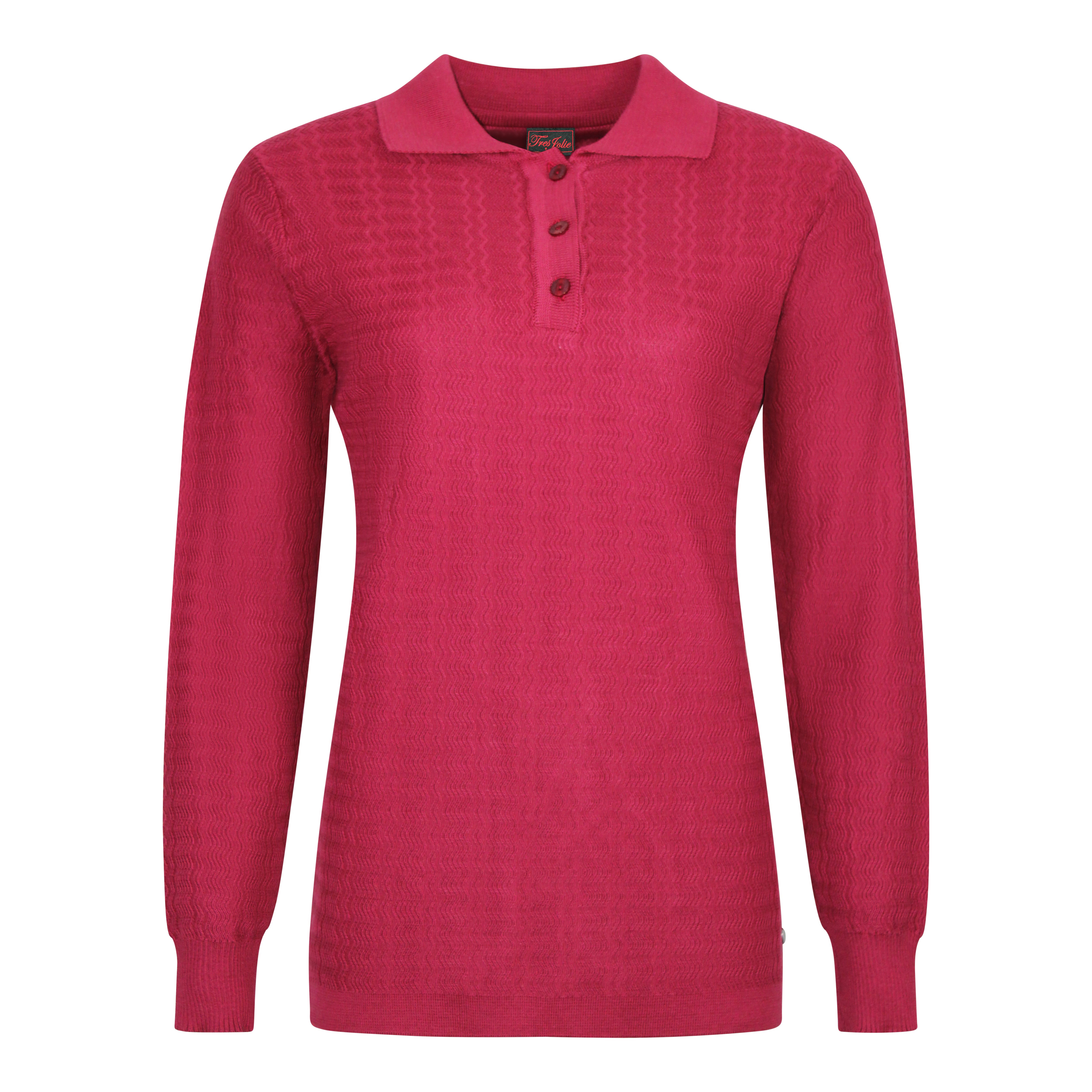 Basic trui in een golfjes patroon met kraag en knoopsluiting. De trui is uitgevoerd in een recht model met lange mouwen. De trui laat zich gemakkelijk combineren en voelt soepel en zacht aan, wat zorgt voor een optimaal draagcomfort.