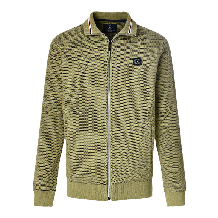 Casual uni vest met opengewerkt gaatjespatroon in een zachte olijfgroene tint. Voorzien van een brede kraag met subtiele streepdetails in zwart, beige en wit. Het rechte model heeft lange mouwen met comfortabele tricot boorden en een praktische ritssluiting. Gemaakt van een soepele, behaaglijke jersey kwaliteit. Ook verkrijgbaar in een lichte zand kleur.