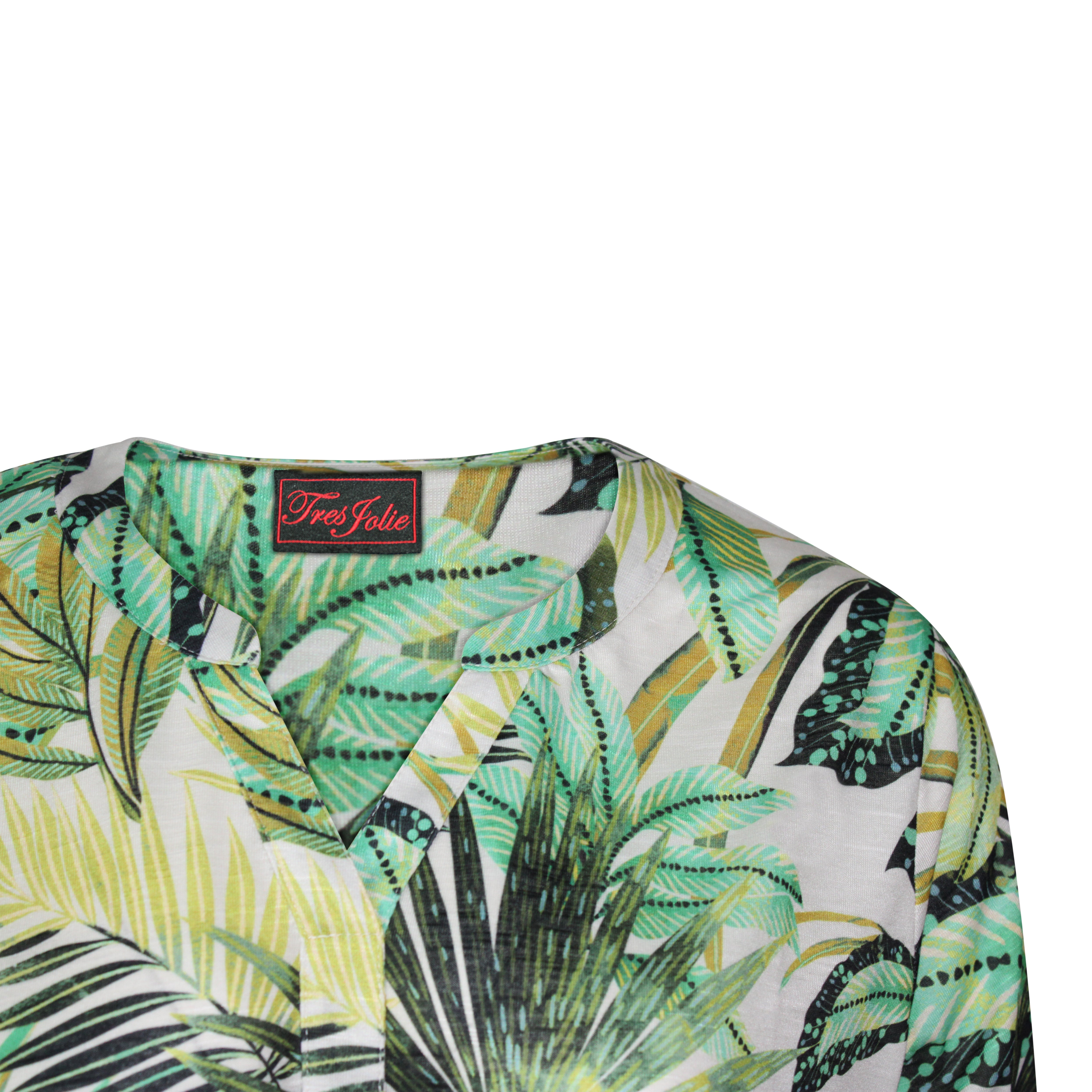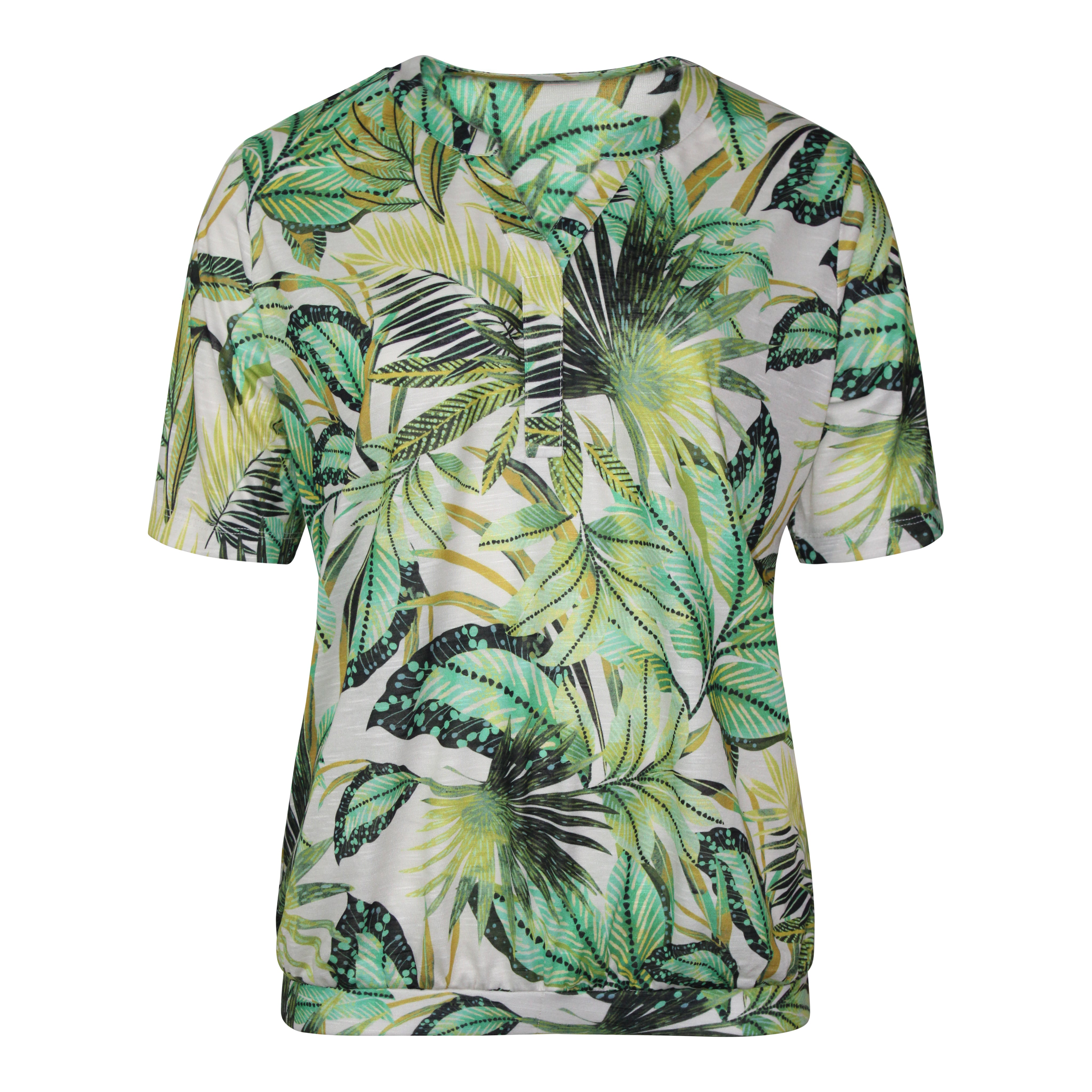 Blouson met fris bladmotief in prachtige groentinten. Met ronde halslijn, kort mouwtje en een splitje middenvoor krijgt het een luchtige look. De brede elastische onderboord creëert een licht blousend effect - een echte eyecatcher voor elke outfit!