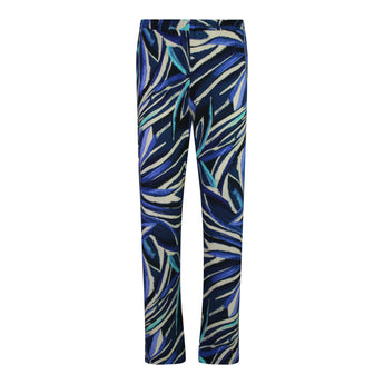 Deze pantalon heeft een luchtige, soepele pasvorm en is voorzien van een comfortabele elastische tailleband. Het blad dessin en de mooie indigo tinten geven een frisse, stijlvolle uitstraling. Gemaakt van een elastische viscose kwaliteit die prettig draagt. Perfect te combineren voor zowel een casual als een geklede look.