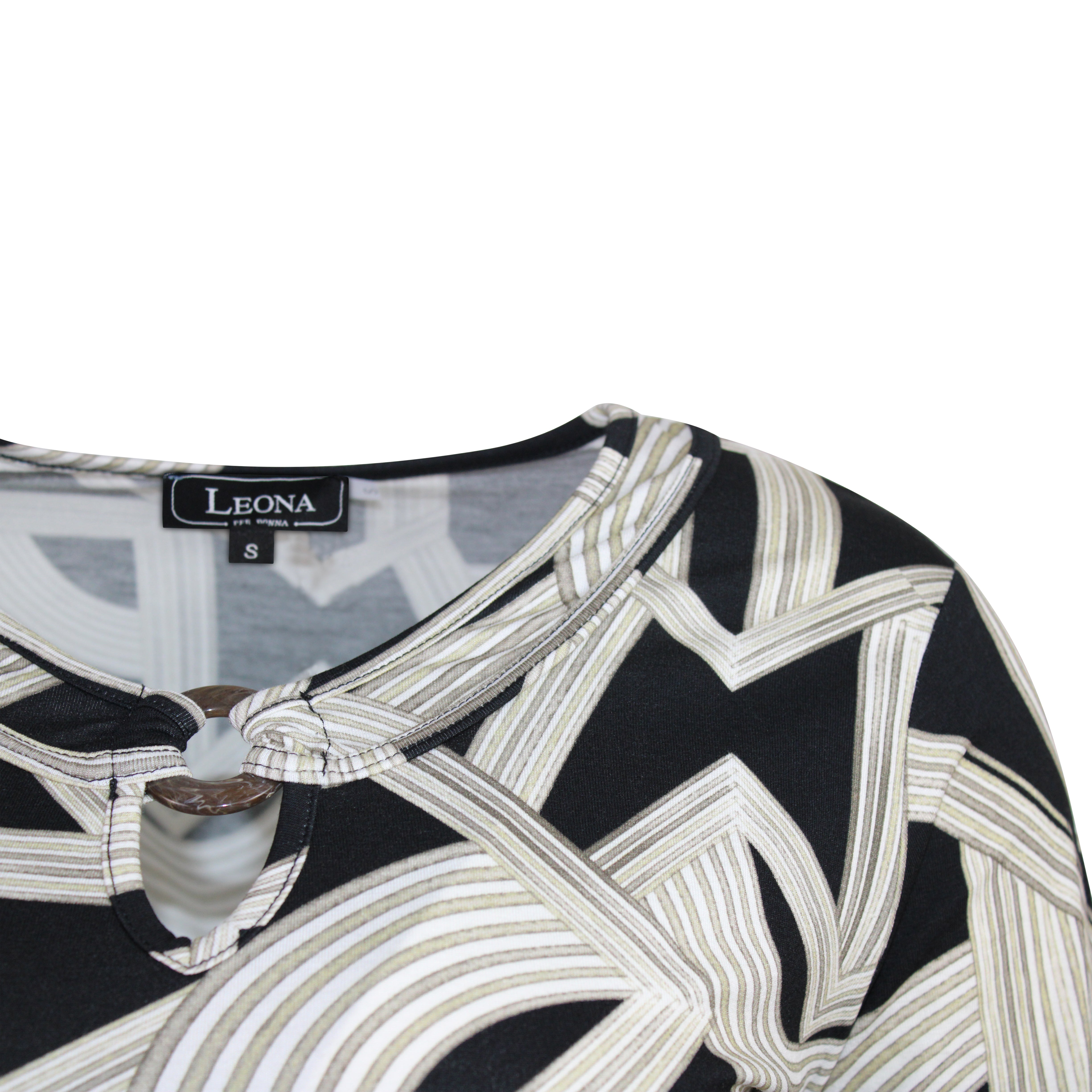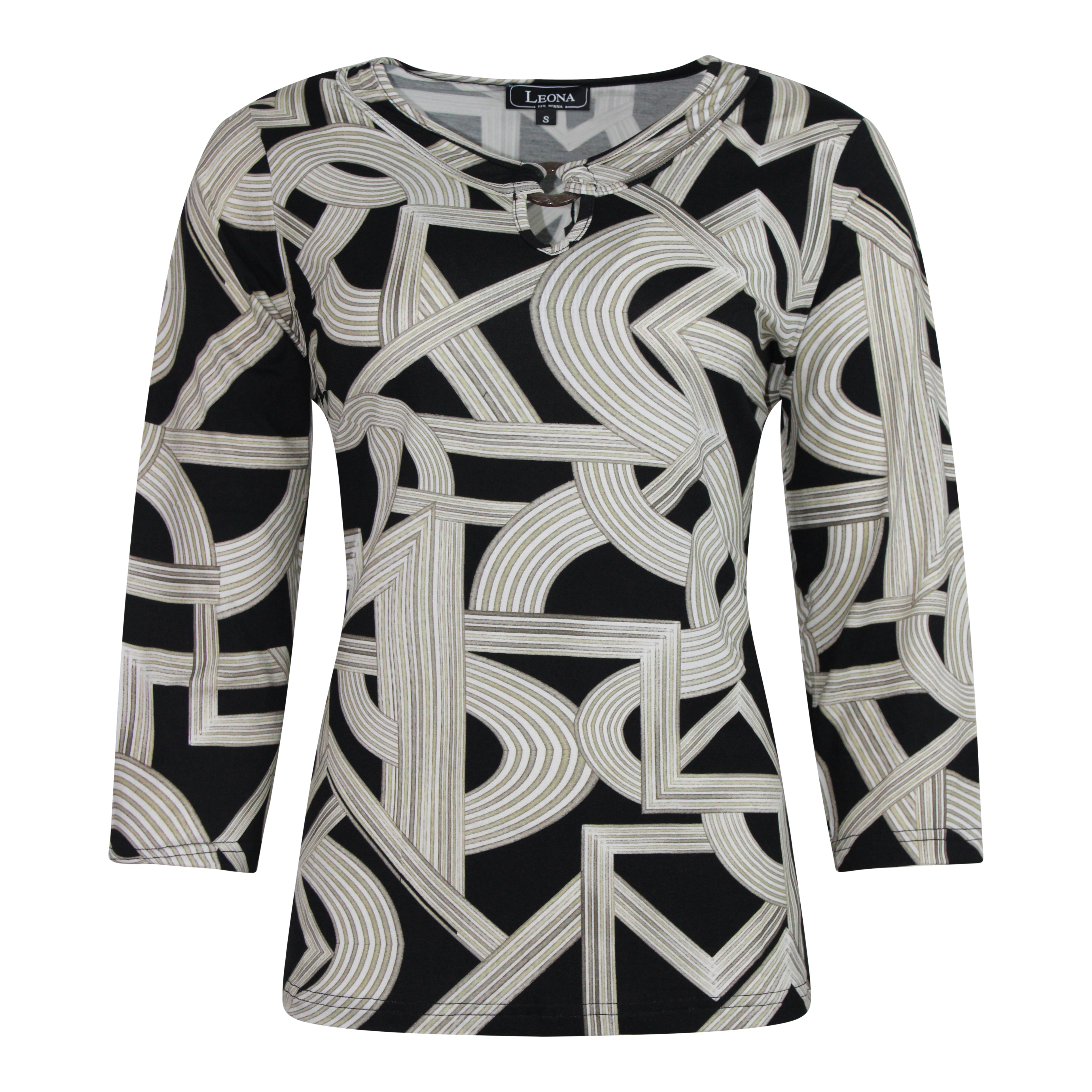 Een comfortabel shirt met een elegante art-deco twist in zwart- en beigetinten. Het rechte model heeft 3/4 mouwen en een ronde halslijn met subtiel splitje, afgewerkt met een decoratieve ring. De zachte en soepele viscosekwaliteit zorgt voor een heerlijk draagcomfort. Ook verkrijgbaar in de kleur marine/wit
