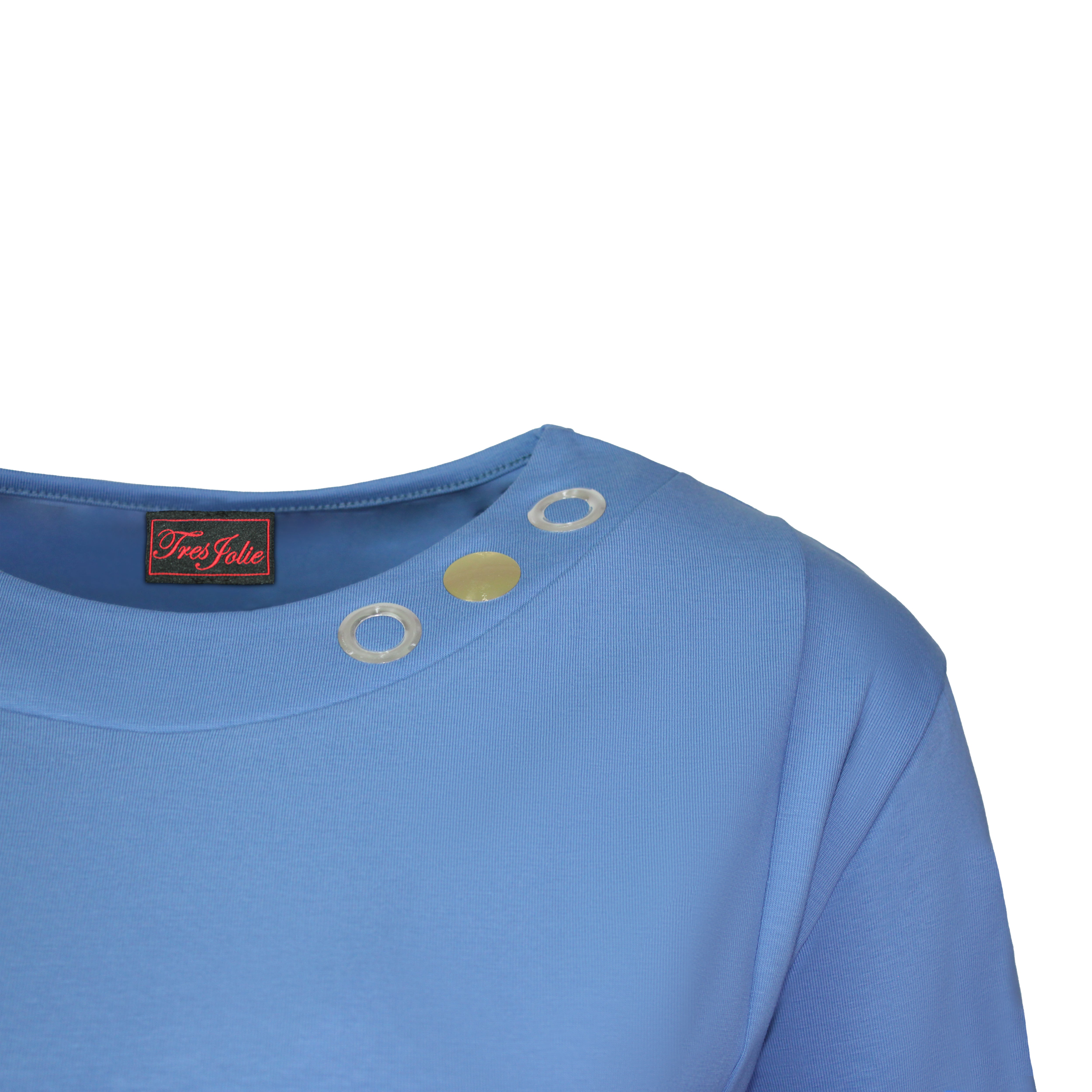 Blauw T-shirt met ronde halsijn, elegant afgewerkt met zilveren en gouden sierringen.