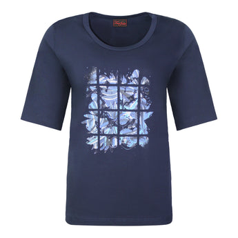 Uni shirt met mozaïek print in het donkerblauw. Dit shirt heeft een ronde halslijn en iets langere korte mouwen voor een moderne look. De zachte en soepele jersey kwaliteit zorgt voor optimaal draagcomfort, de hele dag door. Perfect om casual te dragen, maar ook makkelijk te combineren met een nette broek of rok
