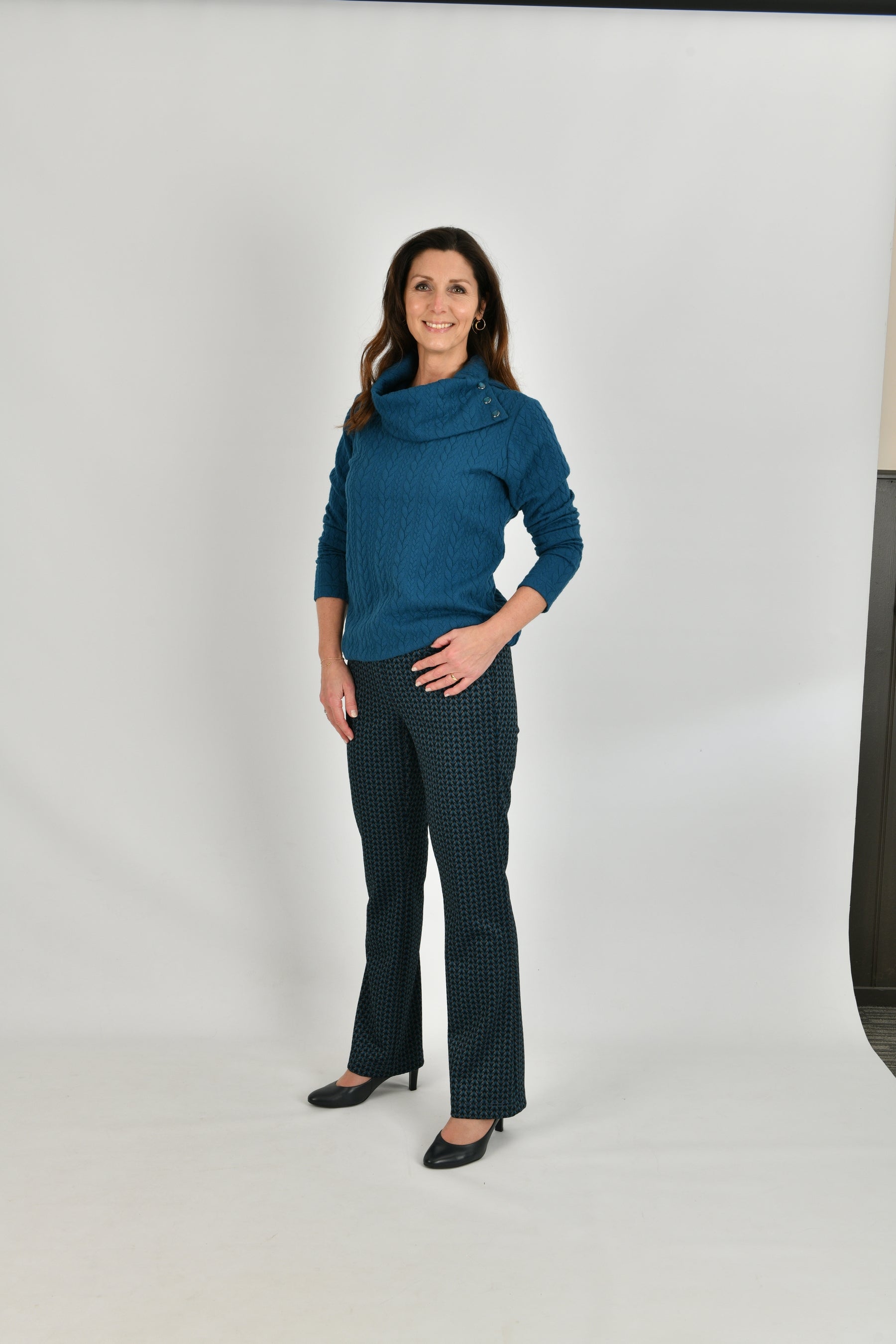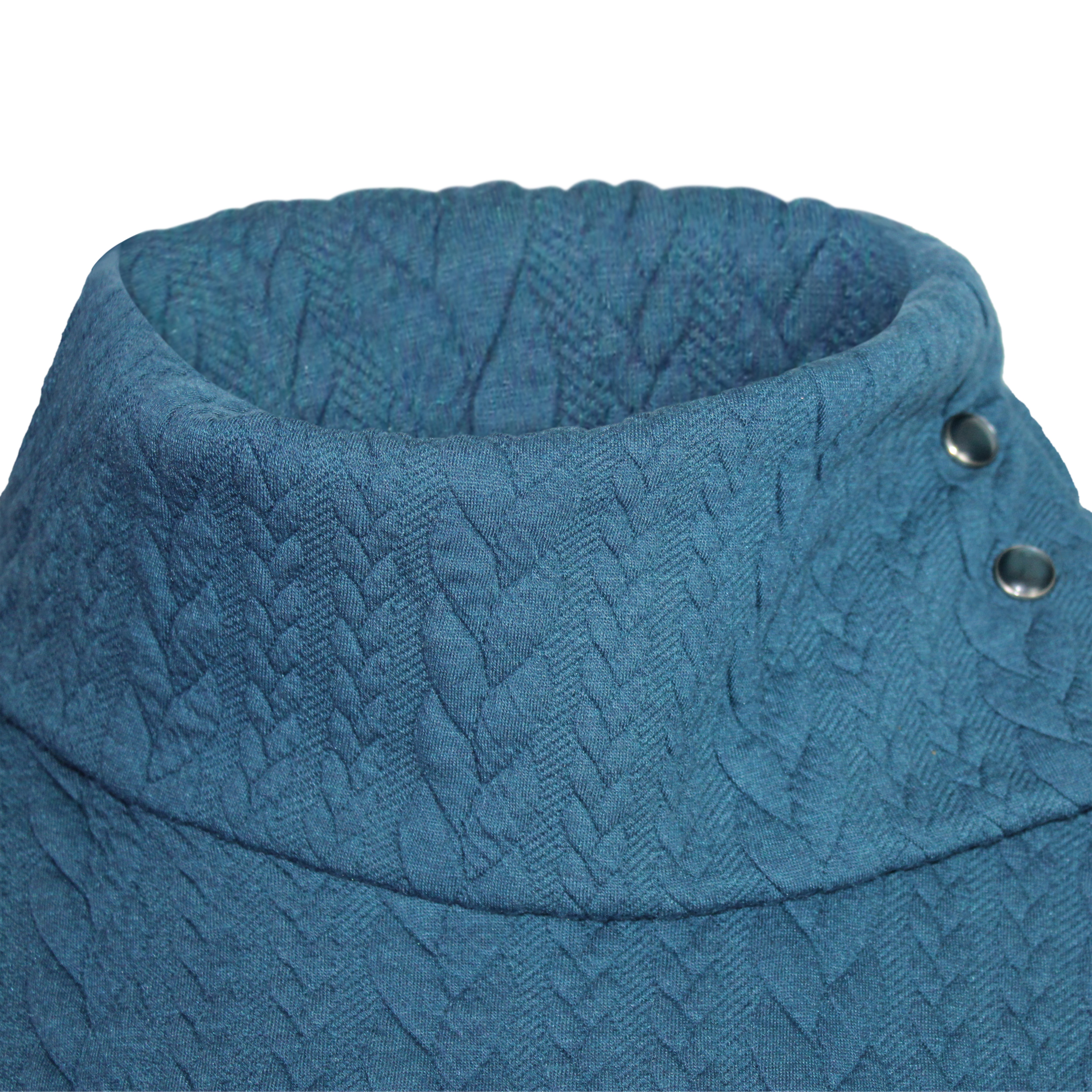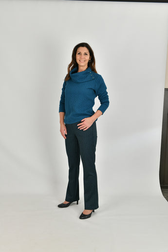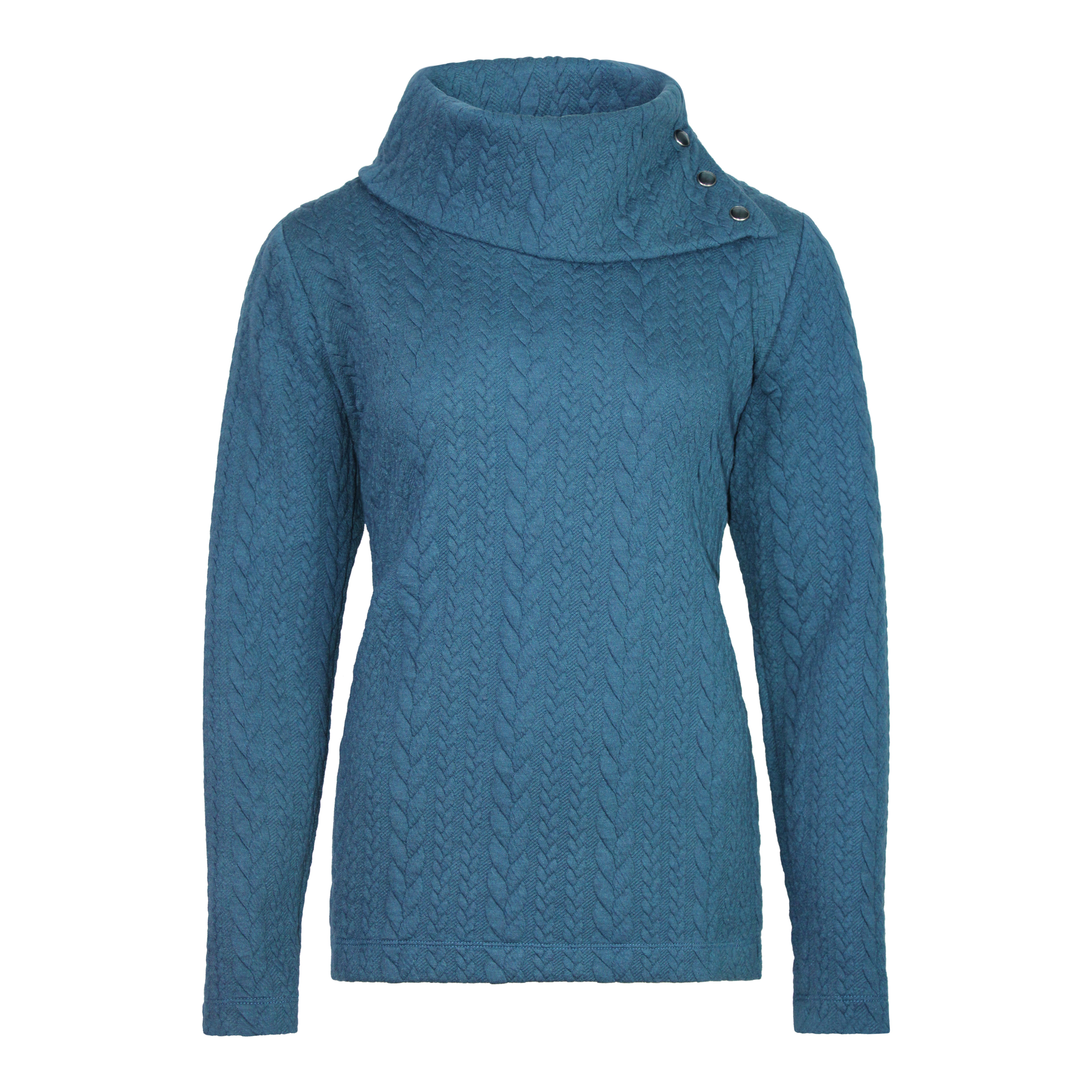 Casual trui in een kabelpatroon uitgevoerd in een mooie petrol kleur. De trui heeft een ruime openvallende col welke versierd is met bijpassende knoopjes. De trui is gemaakt van een soepele zachte jersey kwaliteit met optimaal draagcomfort.