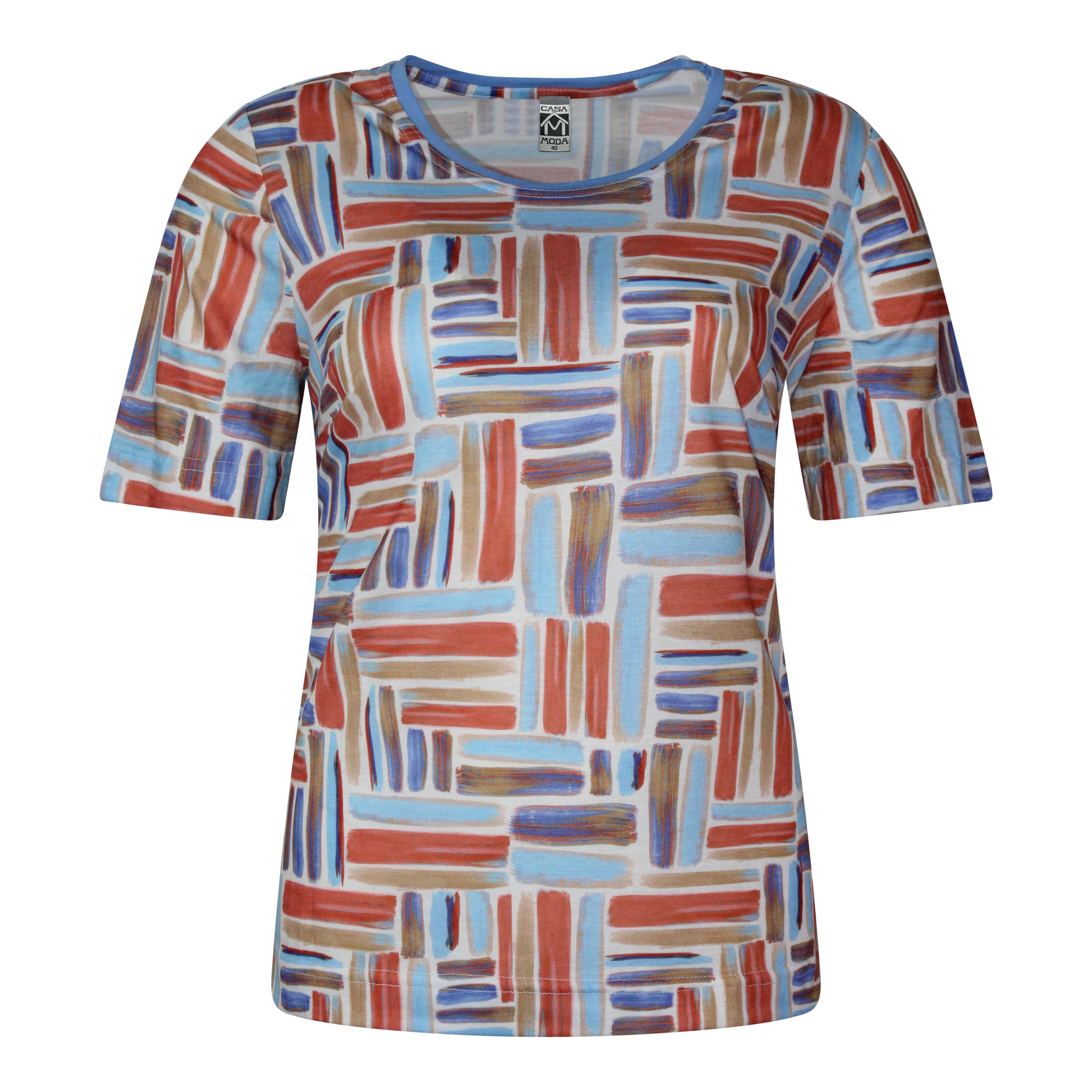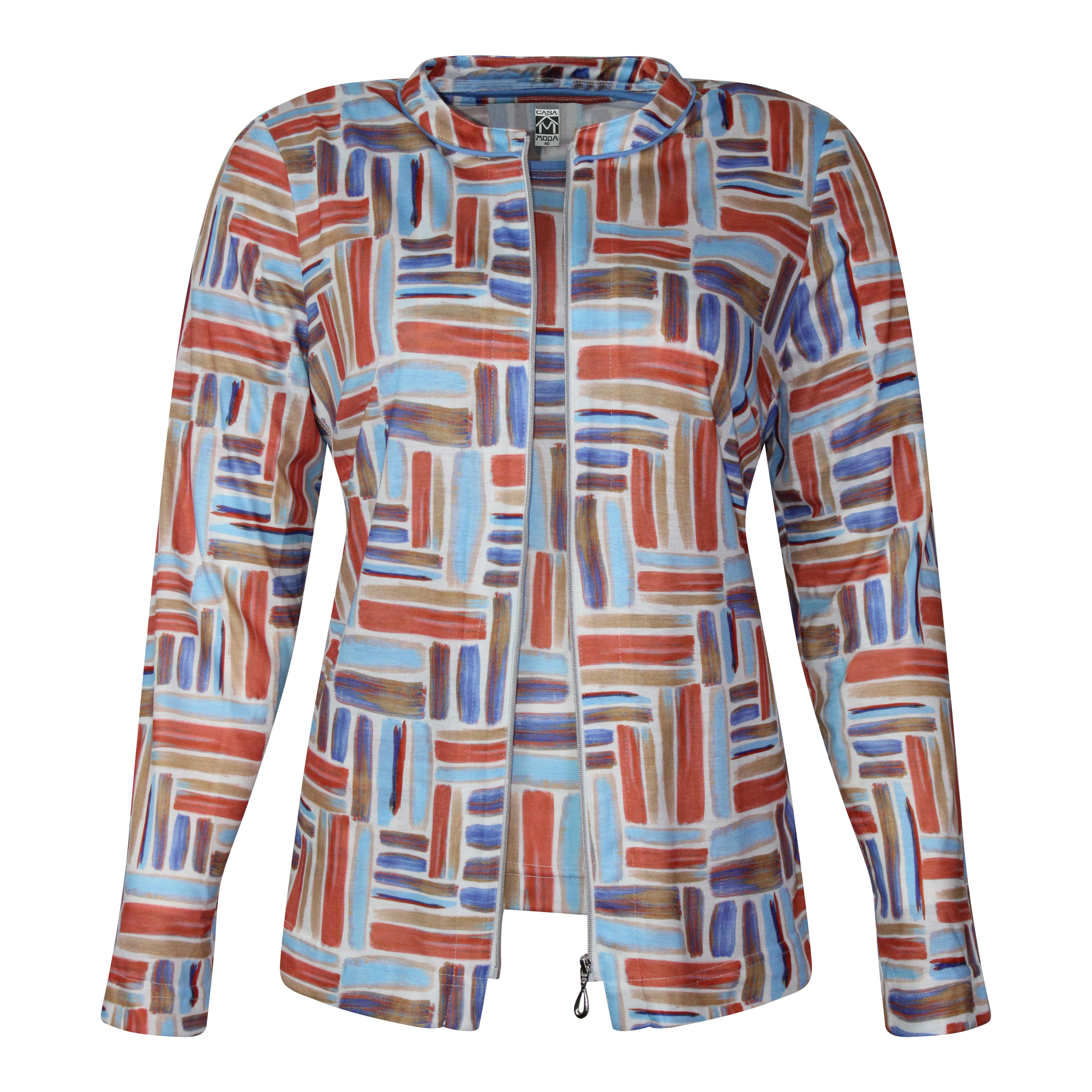 Voorjaars twinset in geschilderde blokken print gecombineerd met een kleurencombinatie van terracotta en licht blauw tinten. Een echte blikvanger dankzij de fleurige kleuren en het moderne dessin.