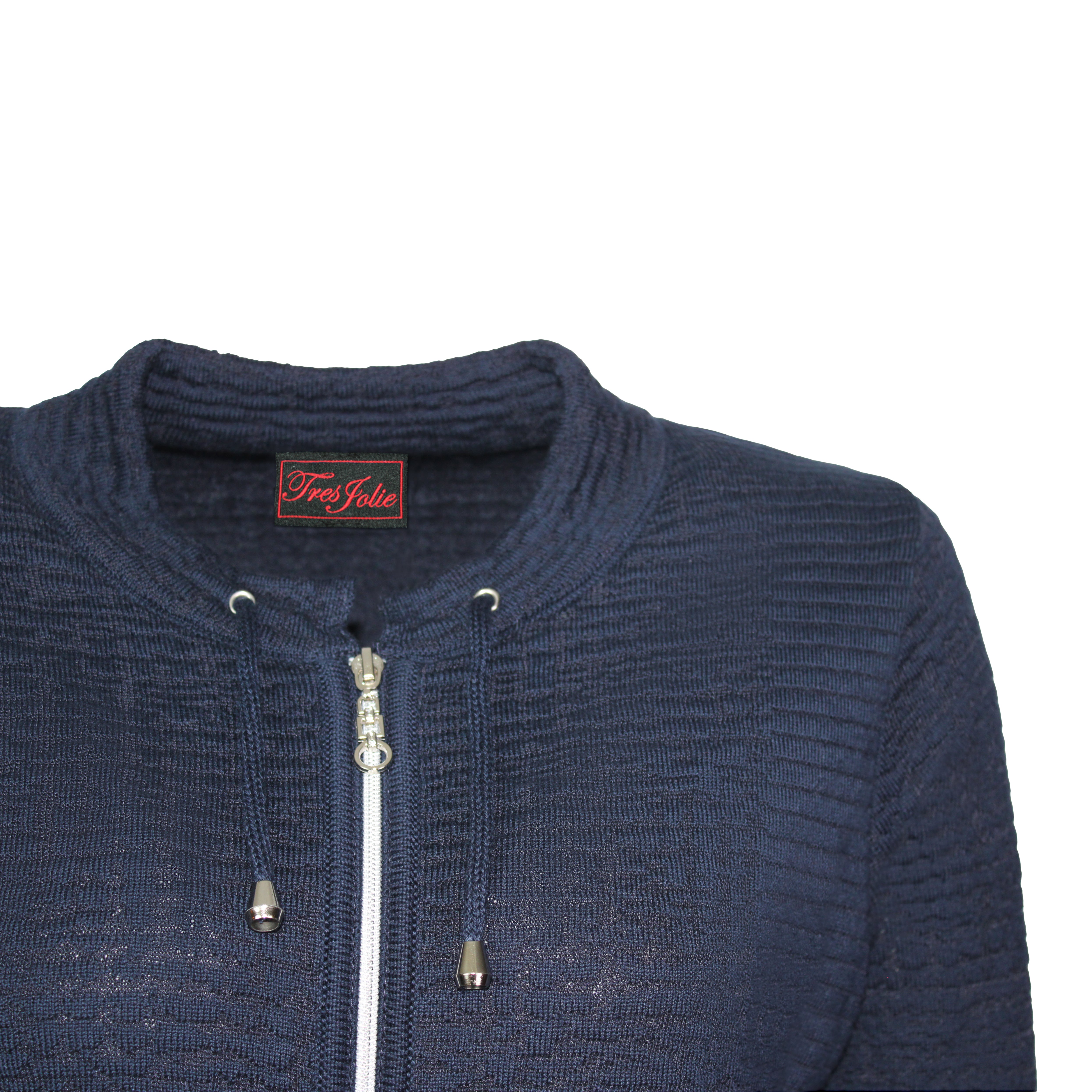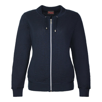 Marine vest met subtiele reliëfstructuur. Voorzien van ritssluiting, opstaand boordje met koordje, manchetten en brede onderboord. Gemaakt van zachte, soepele elastische jerseykwaliteit voor optimaal draagcomfort. Makkelijk te combineren en perfect voor dagelijks gebruik.
