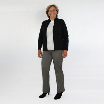 Stijlvol gebreid vest in een mooie zwarte kleur. Het vest heeft een ritssluiting, een gesmokte opstaande boord en een recht model. De afwerking is verfijnd met een onderpand in een gerstekorrel en een subtiele wyber rand aan zowel de onderzijde als de manchetten. Het vest voelt zacht en behaaglijk aan en heeft een optimaal draagcomfort. Het vest laat zich gemakkelijk combineren.