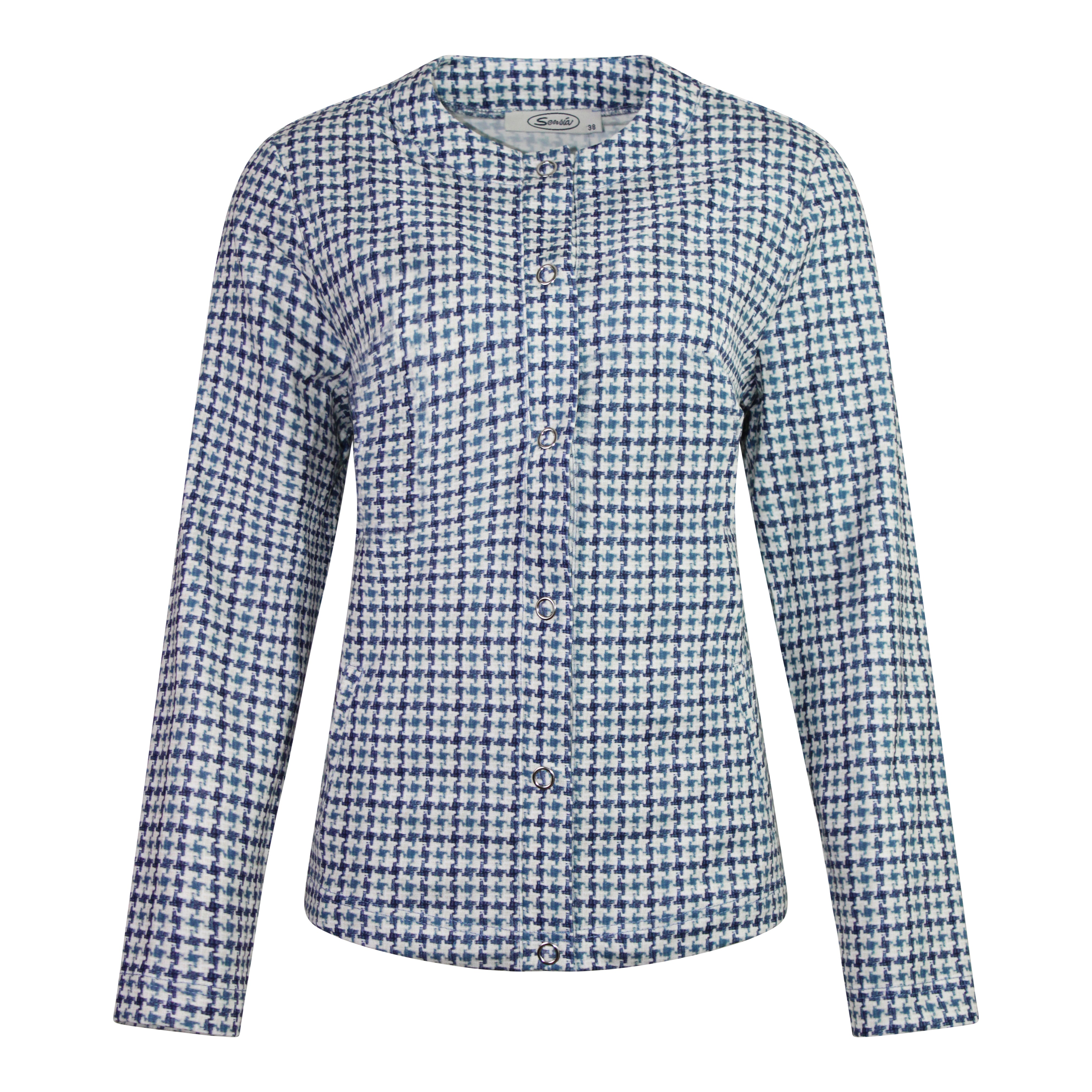 Dit elegante vestjasje in blauw en ecru heeft een tijdloze pied-de-poule print en een chique uitstraling. De ronde halslijn en drukknoopsluiting geven het jasje een verfijnde look. Dankzij de zachte, soepele stof biedt het optimaal draagcomfort. In het voorpand zijn subtiele zakken verwerkt, wat het jasje zowel praktisch als stijlvol maakt. Perfect om elke outfit net dat beetje extra klasse te geven.