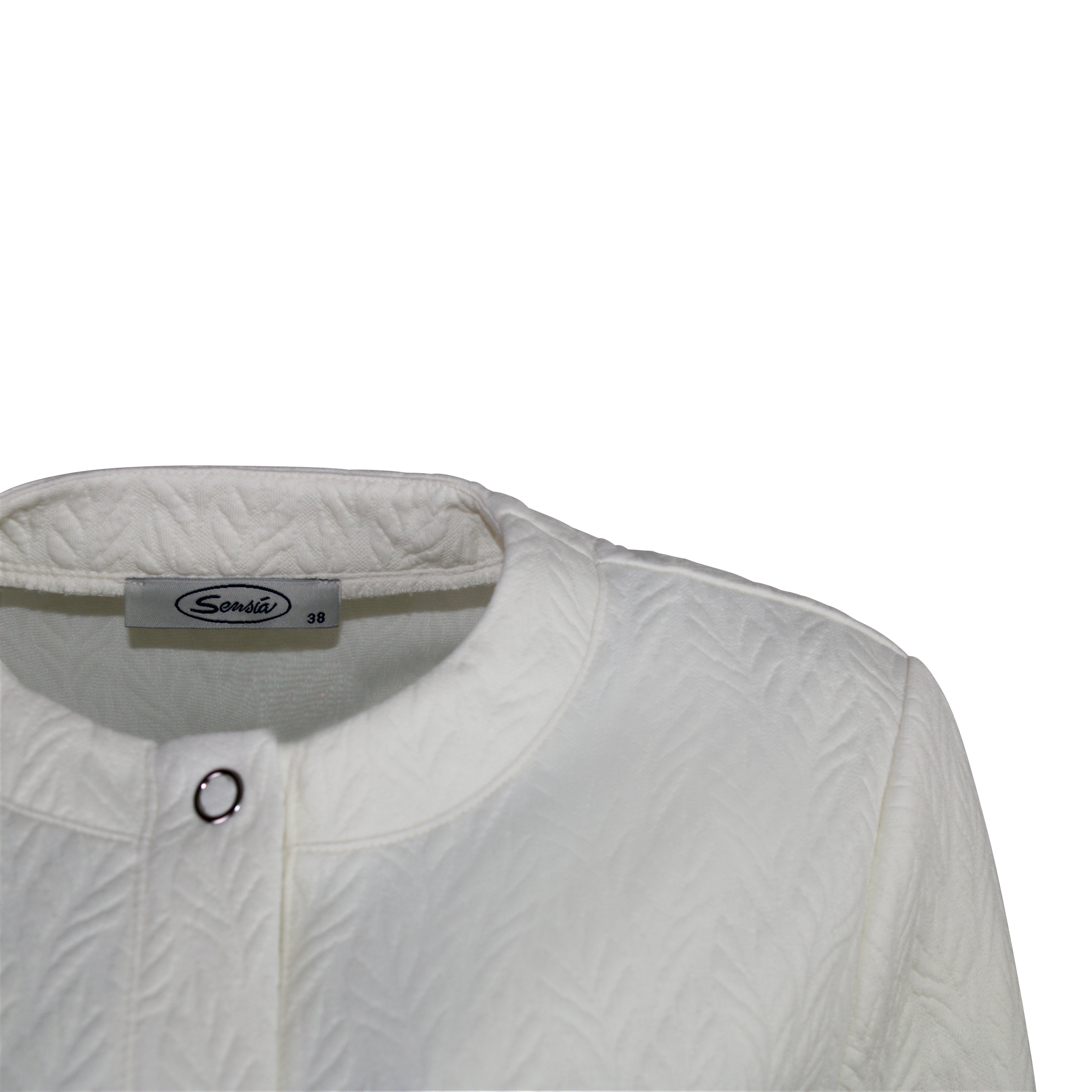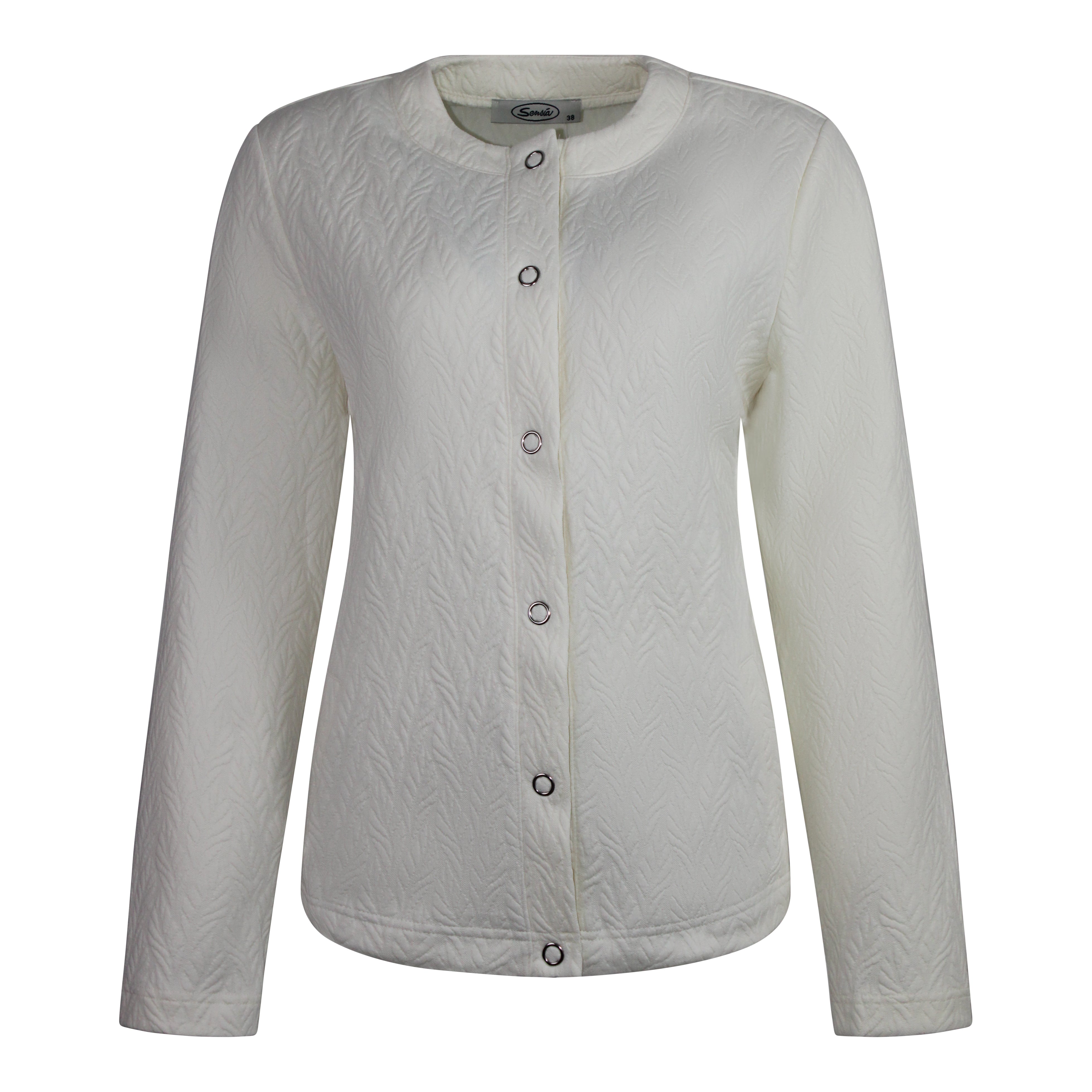 Uni vestjasje met verfijnd bladmotief structuur, ronde halslijn en drukknoopsluiting. Comfortabel, makkelijk te combineren en onmisbaar in je garderobe