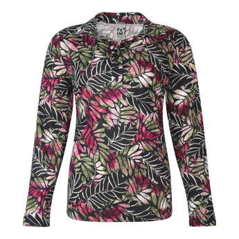 Poloshirt in een zachte behaaglijke winterkwaliteit uitgevoerd in een warme kleurenmix van cassis en olijf tinten. Het poloshirt heeft een ruime kraag en polosluiting met bijpassende knoopjes. Het poloshirt heeft een recht model en lange mouwen. In de zijnaden zijn korte splitjes verwerkt. Het poloshirt is gemaakt van een sterke elastische stofkwaliteit met prettig draagcomfort.