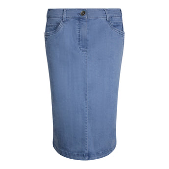 Comfortabele jeansrok in een recht model. Gemaakt van een soepele, elastische jersey kwaliteit die heerlijk zit. De heeft handige zakken in de zijnaden, een knoop- en ritssluiting en riemlusjes voor jouw favoriete riem. Makkelijk te combineren met al je outfits - een echte must-have voor elke garderobe