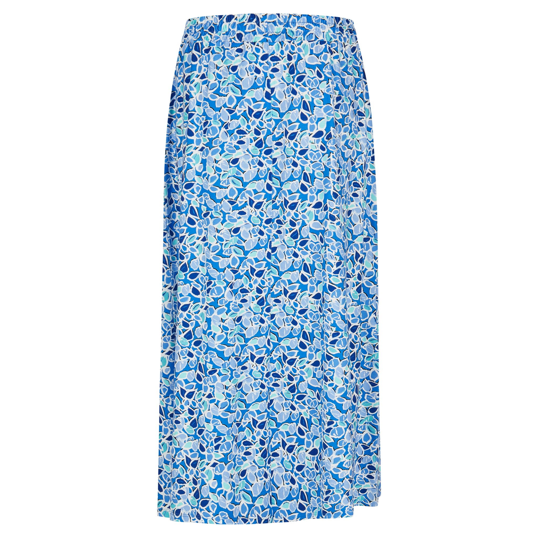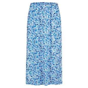 Fleurige lange rok met een botanische bladprint in ocean blue en mint. De elastische tailleband zorgt voor een comfortabele pasvorm, terwijl de zachte en soepele jersey kwaliteit fijn aanvoelt op de huid. De diepe split aan de voorkant geeft de rok een vrouwelijke en speelse uitstraling. Ongevoerd en luchtig, perfect voor een zomerse look.