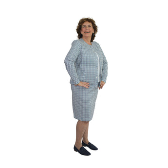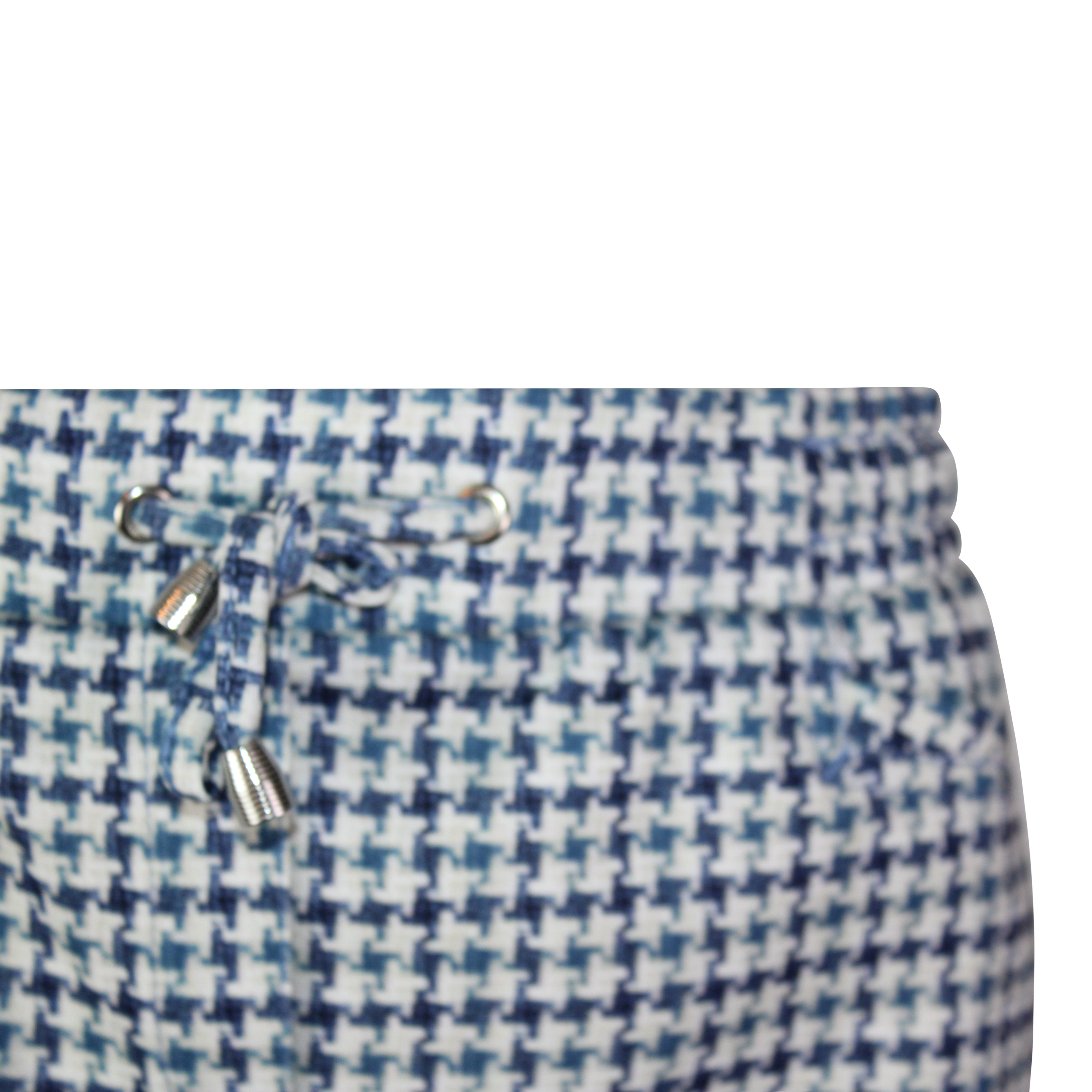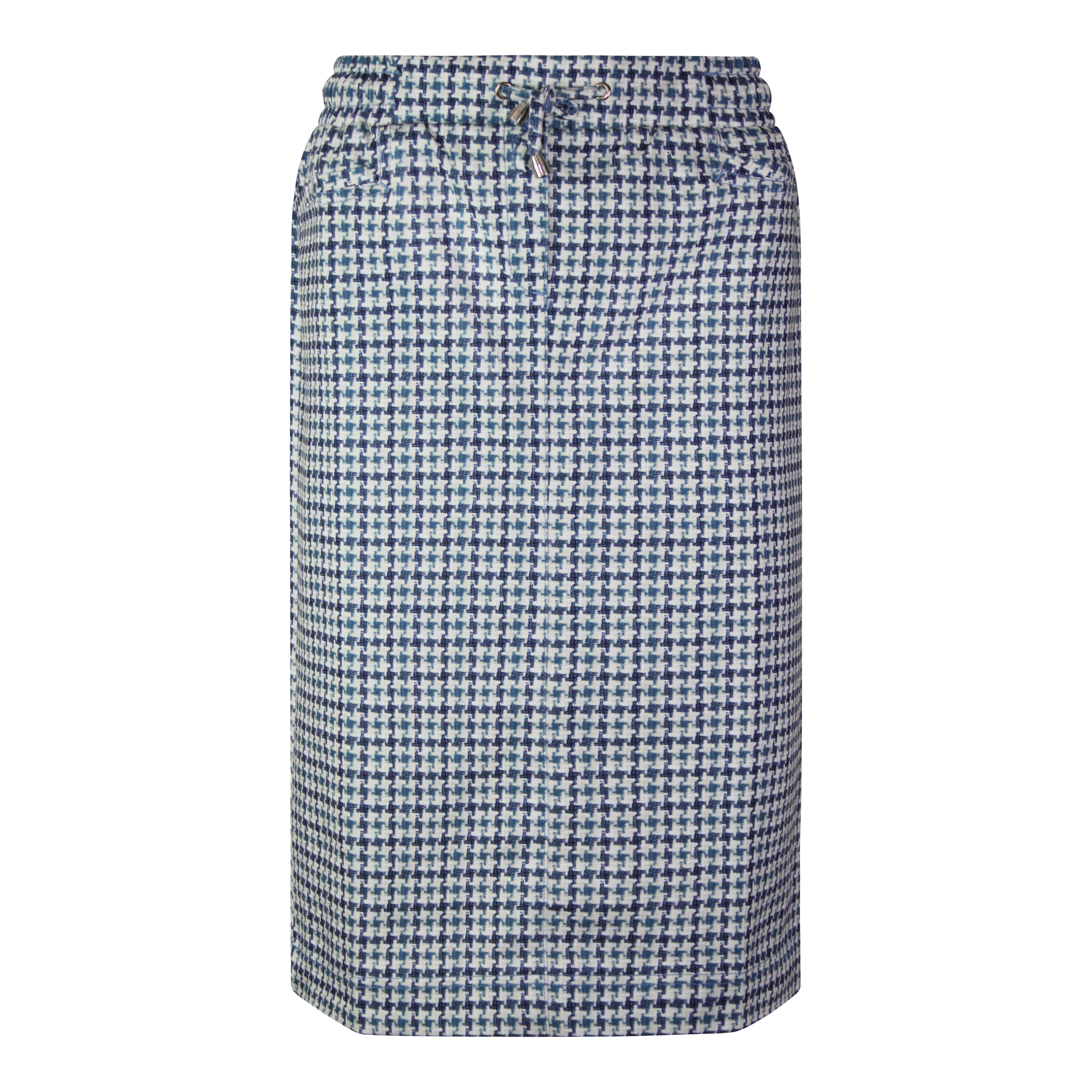 Stijlvolle recht model rok in een klassiek pied-de-poule dessin, uitgevoerd in een mooie raf blauw - ecru kleurcombinatie. De elastische tailleband met verstelbaar koordje zorgt voor een comfortabele pasvorm.
