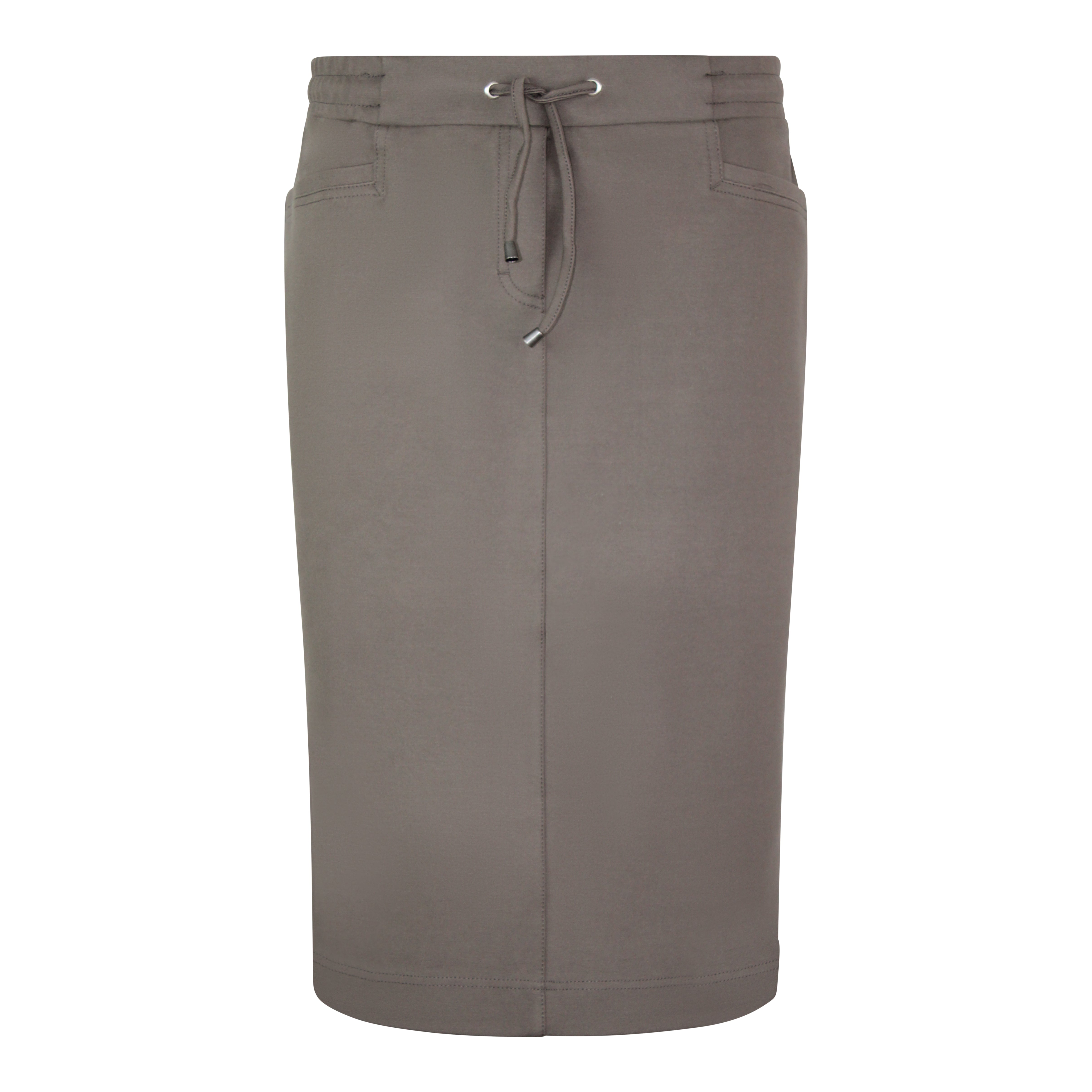 Casual rok in een recht model met elastische tailleband en verstelbaar koordje. De rok is ongevoerd en is uitgevoerd in een warme taupe kleur. In het voorpand zijn steekzakjes verwerkt. De rok voelt zacht en soepel aan en is gemaakt van een elastische jersey kwaliteit met optimaal draagcomfort