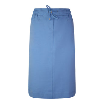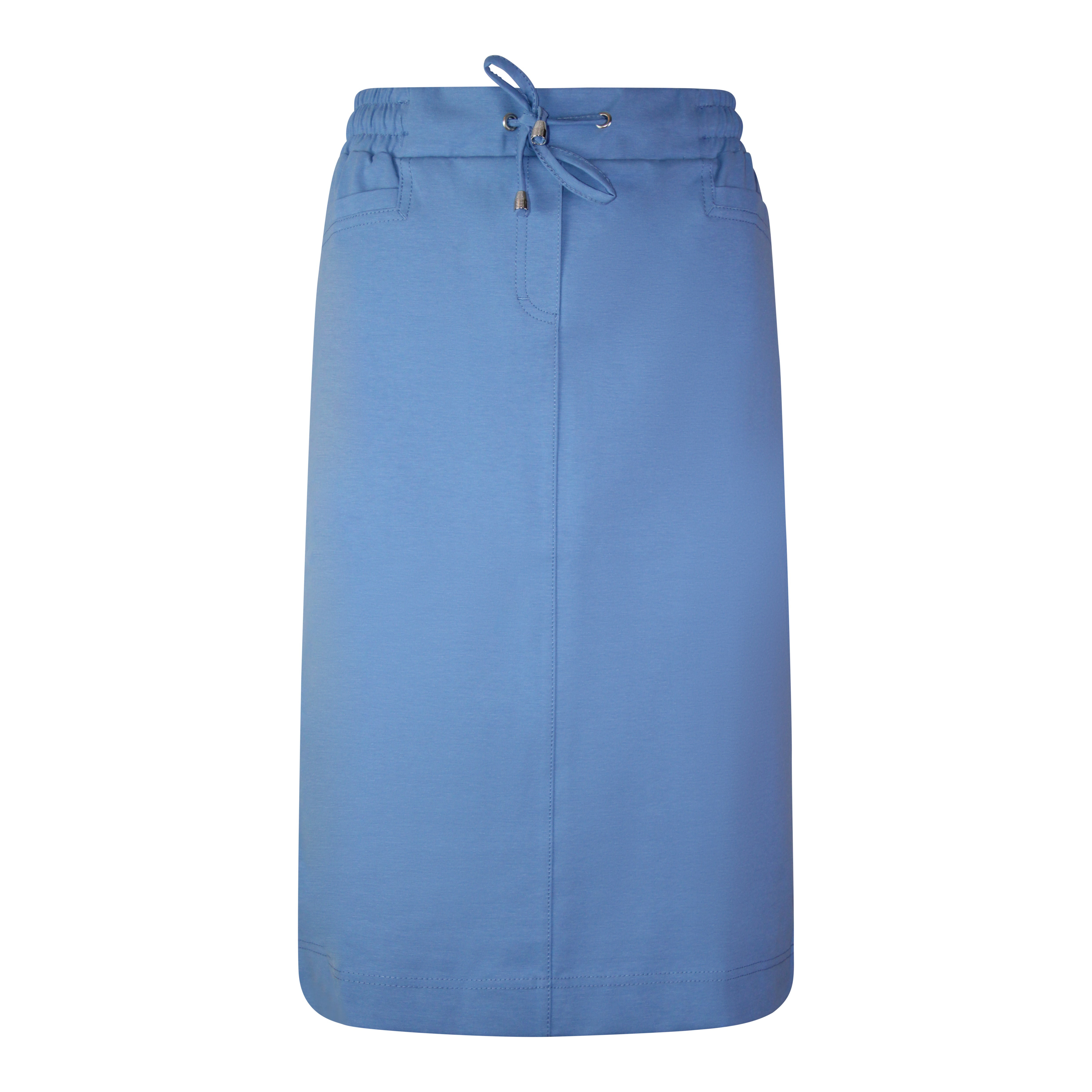 Casual rok in een recht model met elastische tailleband en verstelbaar koordje. De rok is ongevoerd en is uitgevoerd in een fleurige light blue tint. Op het voorpand zijn steekzakjes verwerkt. De rok voelt zacht en soepel aan en is gemaakt van een elastische jersey kwaliteit met optimaal draagcomfort