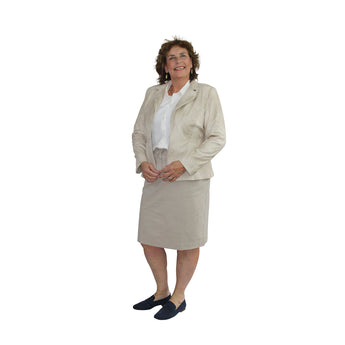 Casual rok in een recht model met elastische tailleband en verstelbaar koordje. De rok is ongevoerd en is uitgevoerd in een zachte beige kleur. Op het voorpand zijn steekzakjes verwerkt. De rok voelt zacht en soepel aan en is gemaakt van een elastische jersey kwaliteit met optimaal draagcomfort