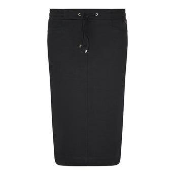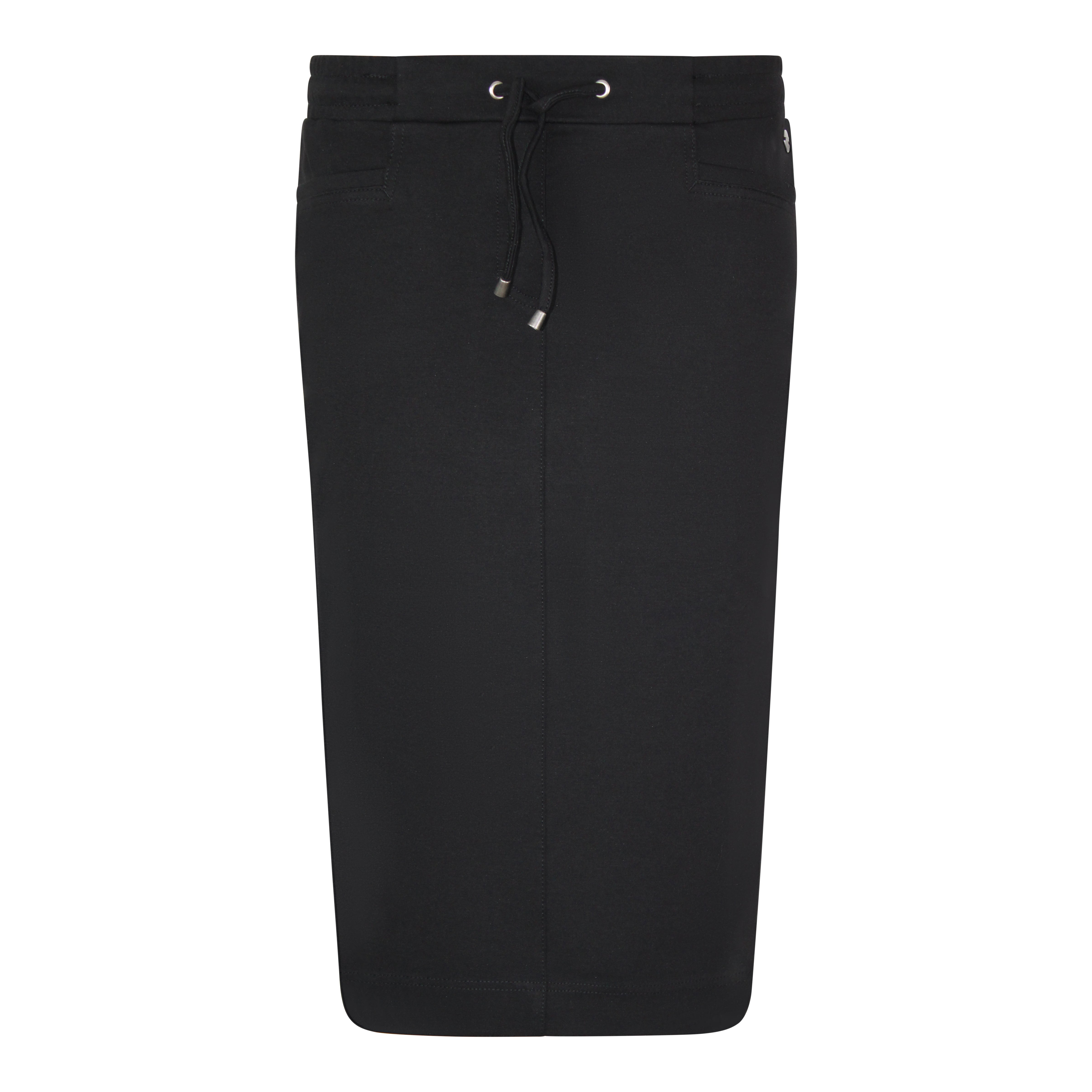 Casual rok in een recht model met elastische tailleband en verstelbaar koordje. De rok is ongevoerd en is uitgevoerd in een mooie zwarte kleur. In het voorpand zijn steekzakjes verwerkt. De rok voelt zacht en soepel aan en is gemaakt van een elastische jersey kwaliteit met optimaal draagcomfort