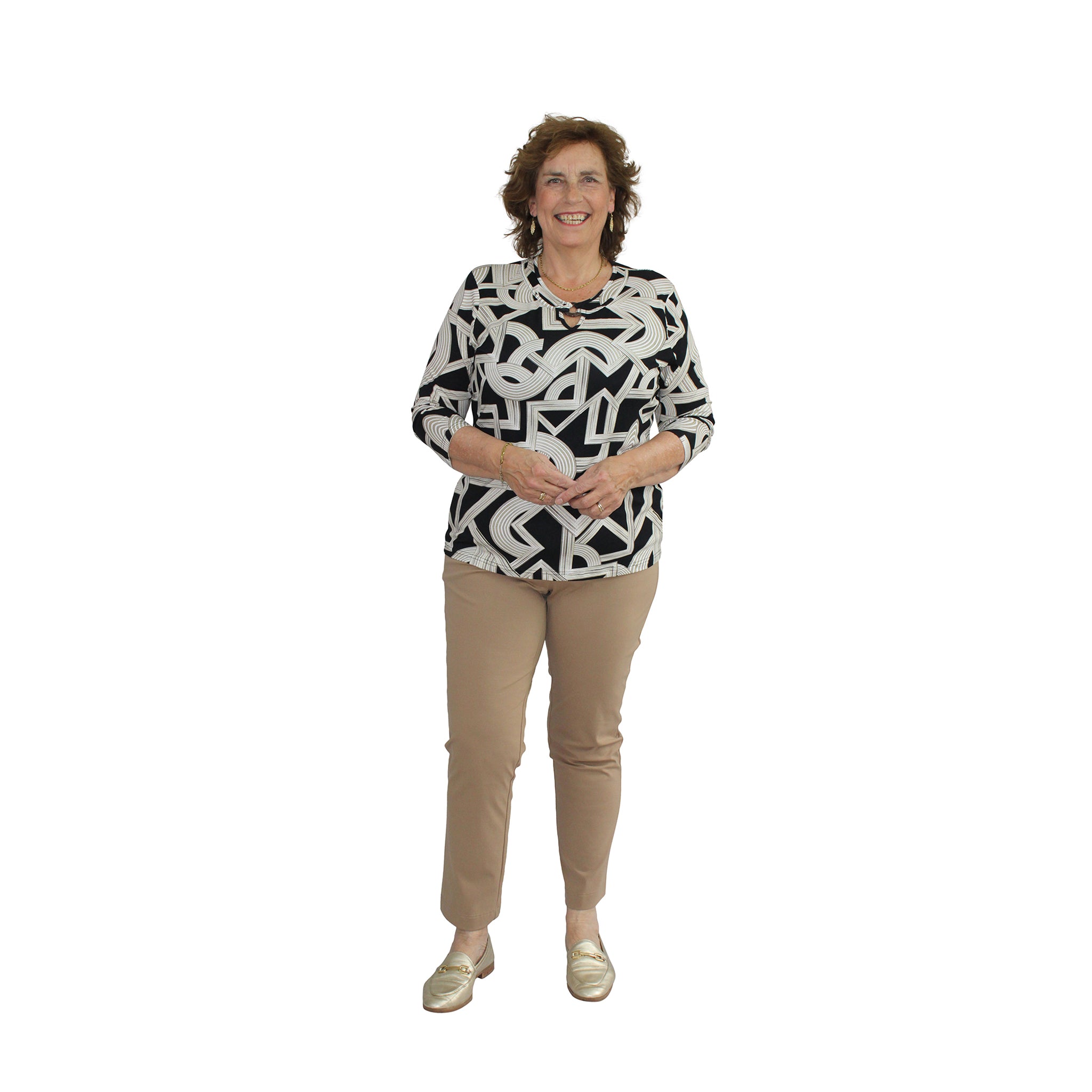 Een comfortabel shirt met een elegante art-deco twist in zwart- en beigetinten. Het rechte model heeft 3/4 mouwen en een ronde halslijn met subtiel splitje, afgewerkt met een decoratieve ring. De zachte en soepele viscosekwaliteit zorgt voor een heerlijk draagcomfort. Ook verkrijgbaar in de kleur marine/wit