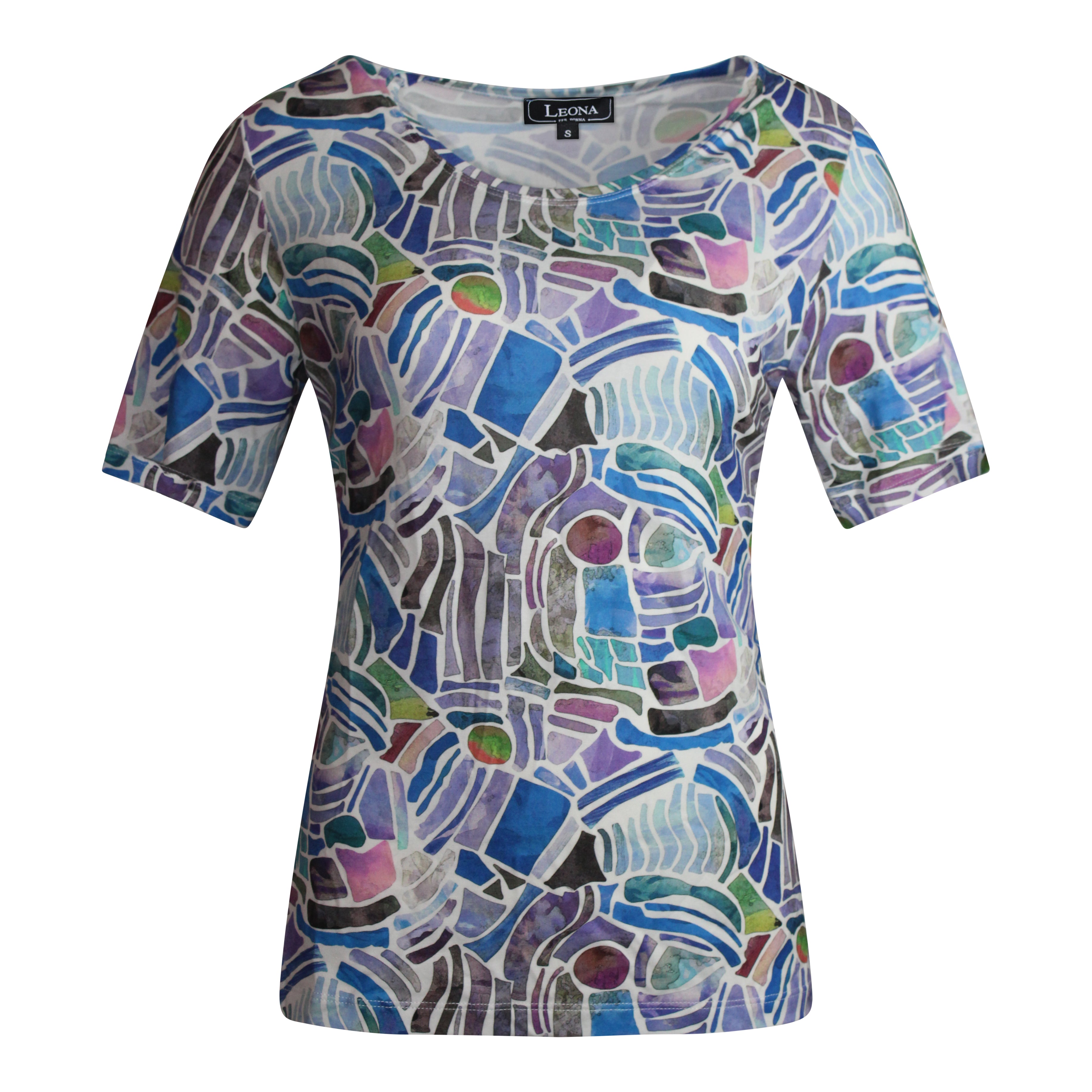 Casual shirt met een vrolijke artistieke print in multicolor. De ronde halslijn en korte mouwen zorgen voor een comfortabele, tijdloze look. Het shirt voelt soepel en zacht aan dankzij de elastische viscose kwaliteit, waardoor het heerlijk draagt. Perfect om makkelijk te combineren voor een frisse en stijlvolle outfit.