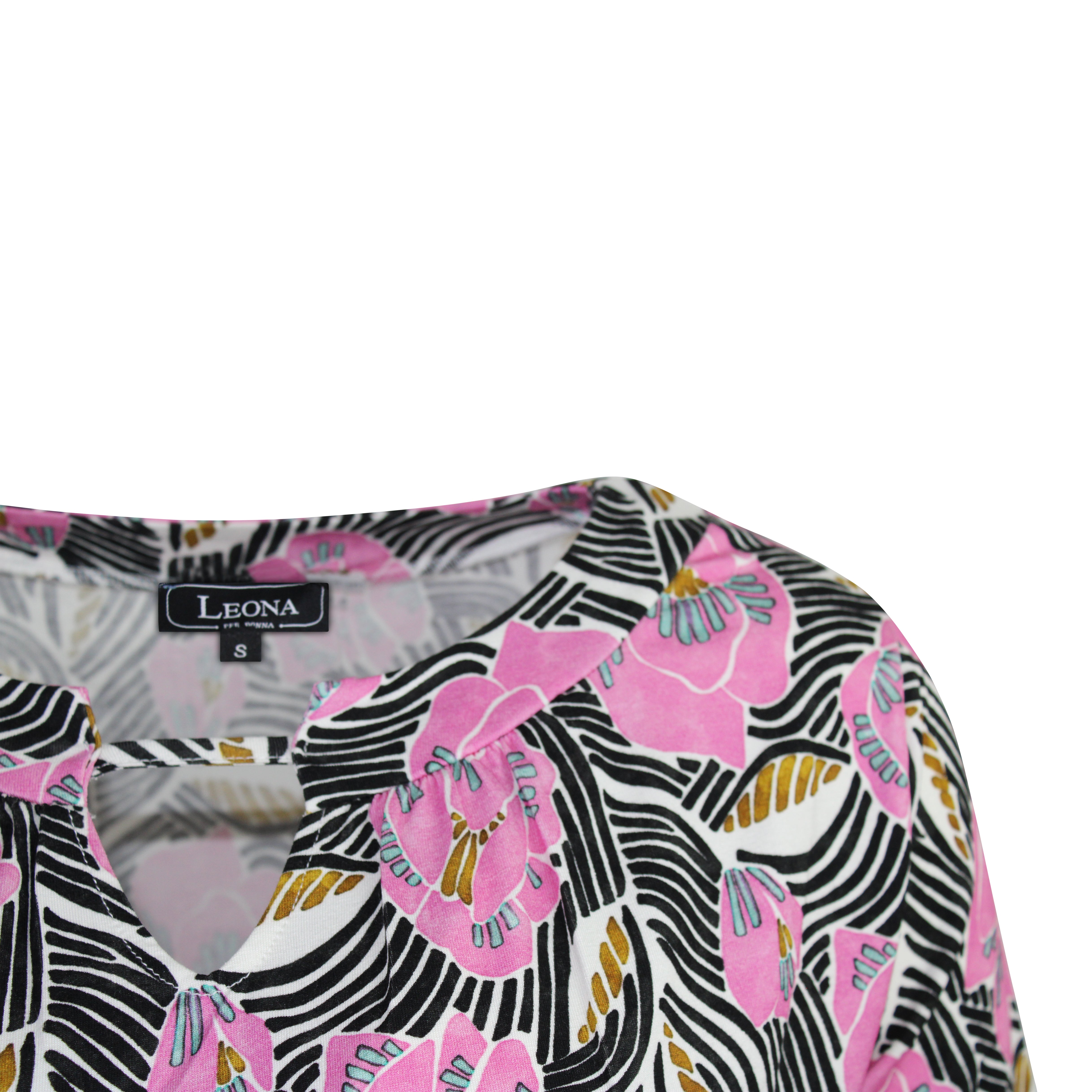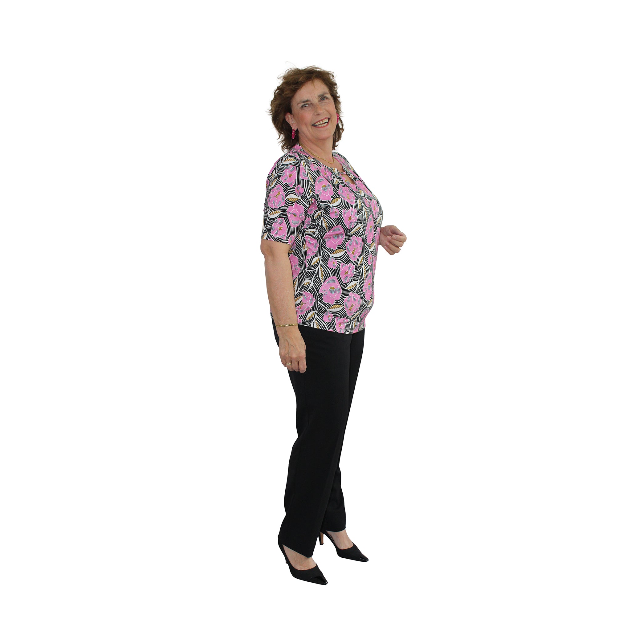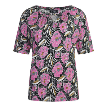 Prachtig shirt met een retro bloemenprint in een fleurige roze tint gecombineerd met zwart. Het shirt heeft een ronde hals met een subtiel splitje en een sierlijk touwtje aan de voorkant. Recht model met korte mouwen en gemaakt van een soepele, zachte stof die heerlijk aanvoelt op de huis