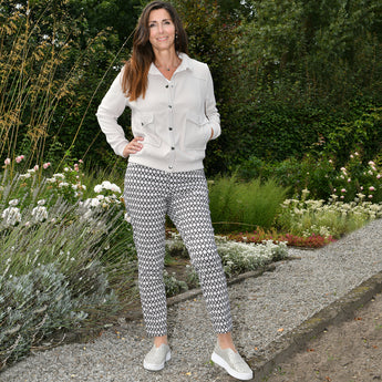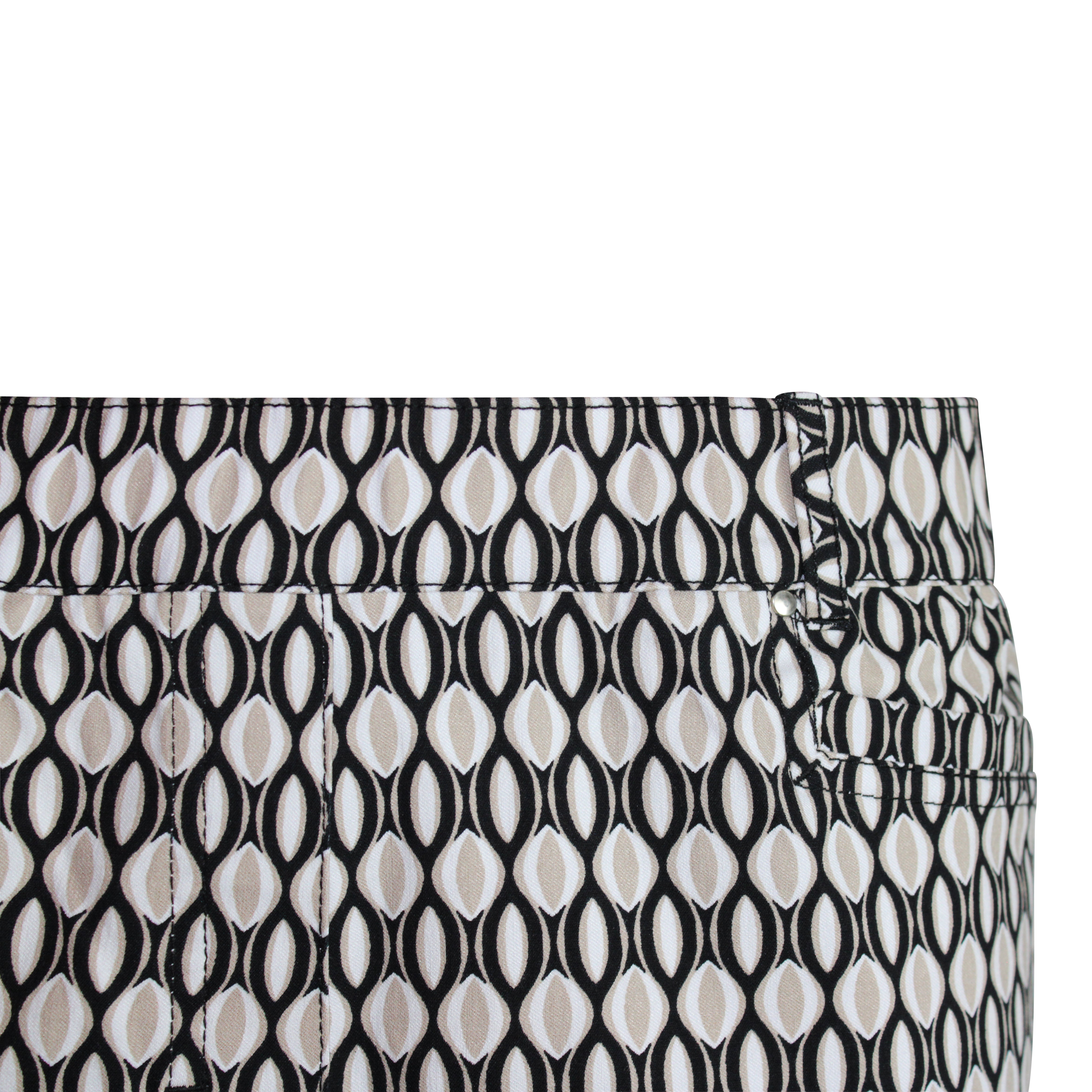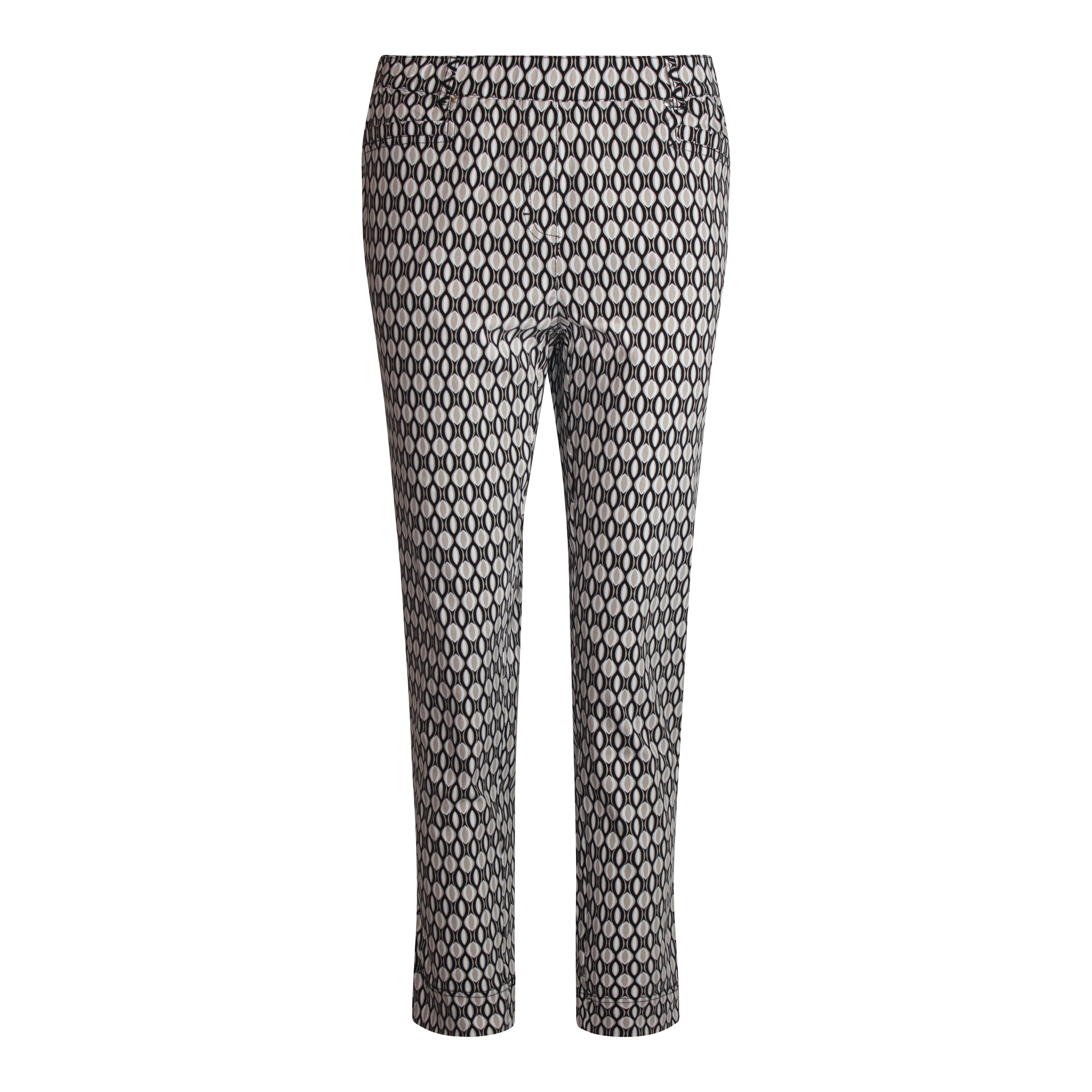 Deze casual stretchpantalon in een stijlvolle retro ovale print is een echte blikvanger voor het voorjaar. De kleurencombinatie van zwart, zand en wolwit geeft de broek een frisse en moderne uitstraling.