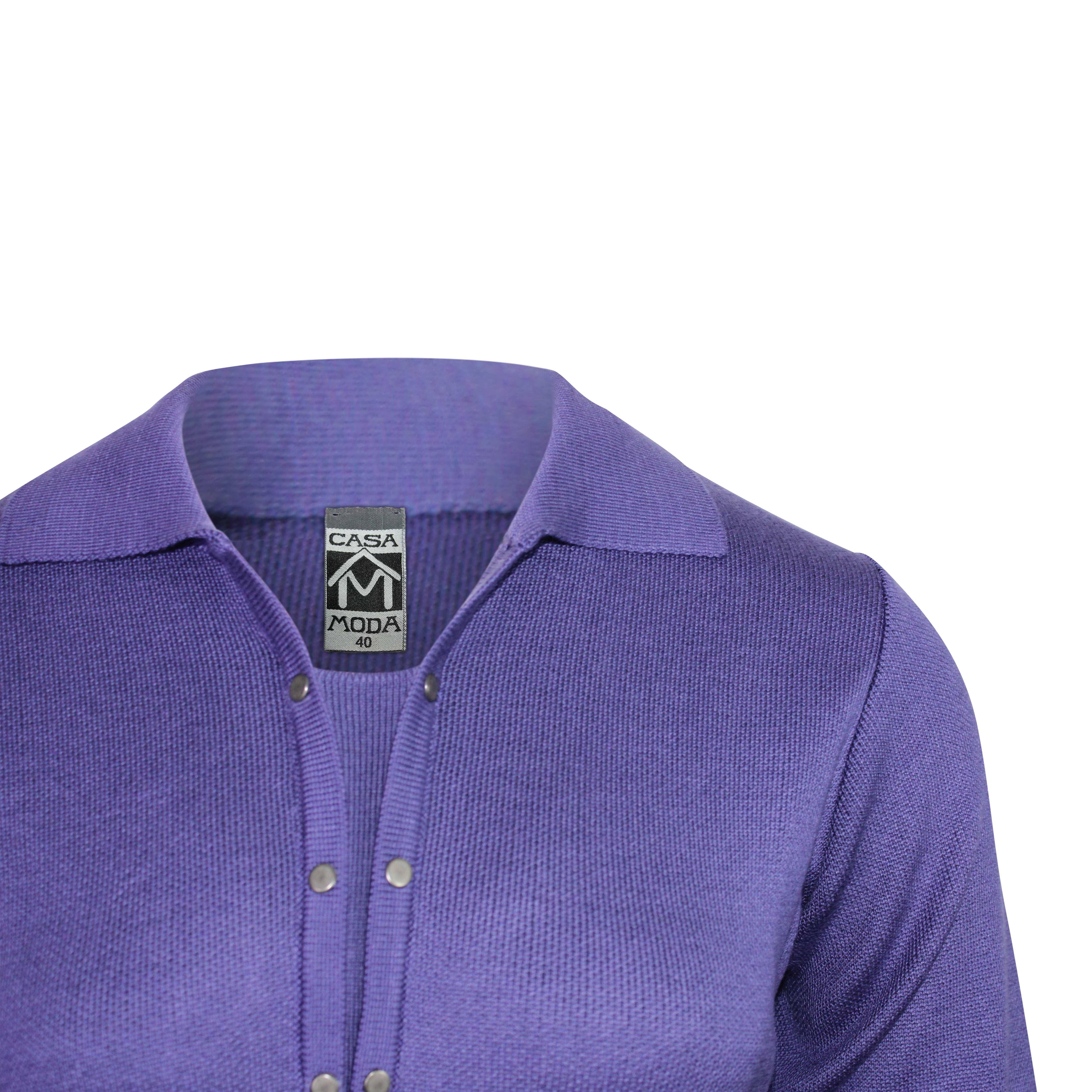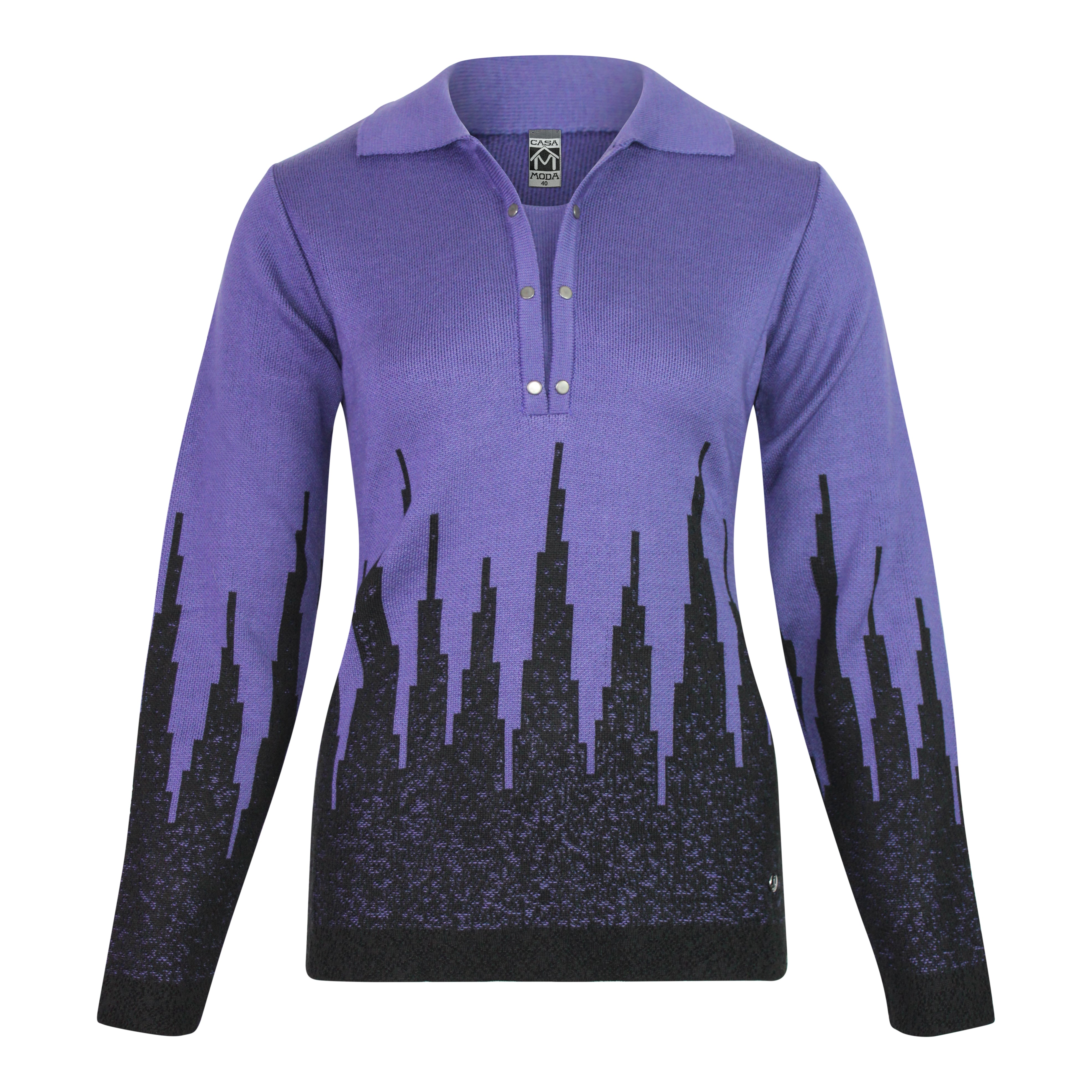 Rijk uitgevoerde gebreide trui in een skyline patroon met een kleurencombinatie van grape en zwart. De trui heeft een kraag met middenvoor een split welke is opgevuld met een stukje stof en is versierd met zilveren drukknoopjes. De trui voelt zacht en behaaglijk aan en heeft een optimaal draagcomfort