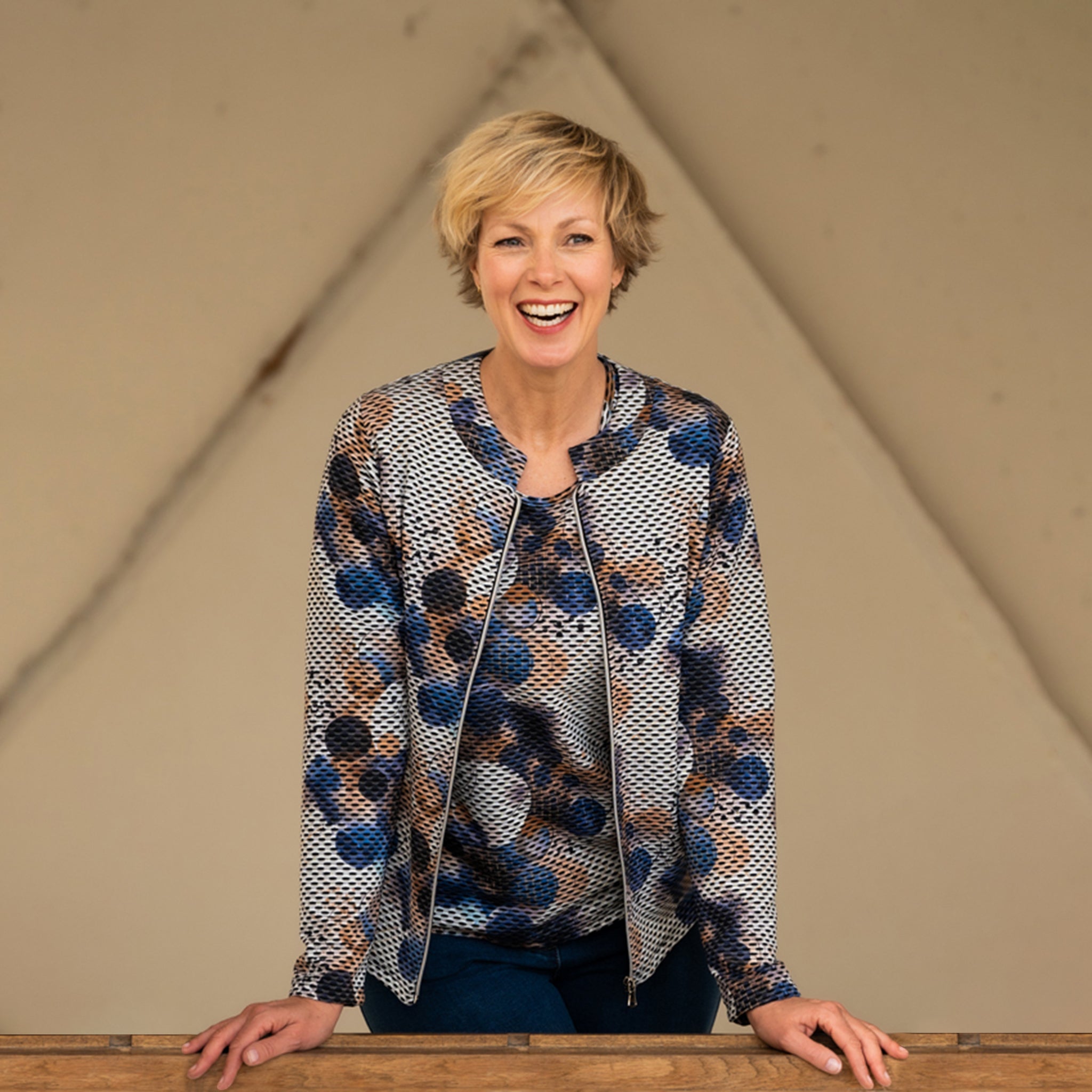 Deze stijlvolle twinset bestaat uit een vest met lange mouwen en een bijpassend shirt met korte mouwen. Het geheel heeft een recht model met een ronde halslijn en is voorzien van een praktische ritssluiting. Dankzij de mix van polyester en viscose met een vleugje stretch biedt de twinset een optimale pasvorm en heerlijk draagcomfort. De moderne grafische stippenprint geeft de twinset een eigentijdse en modieuze uitstraling