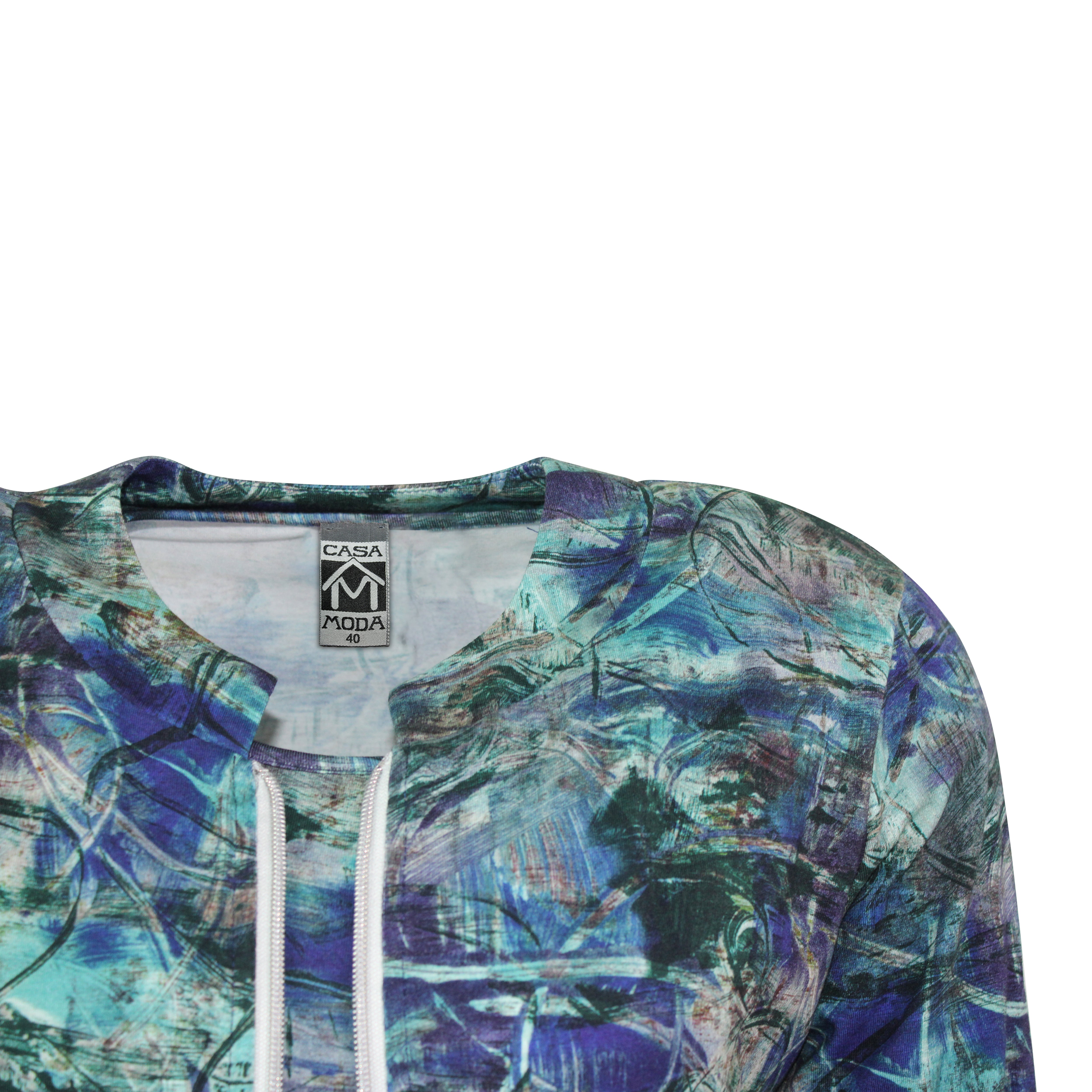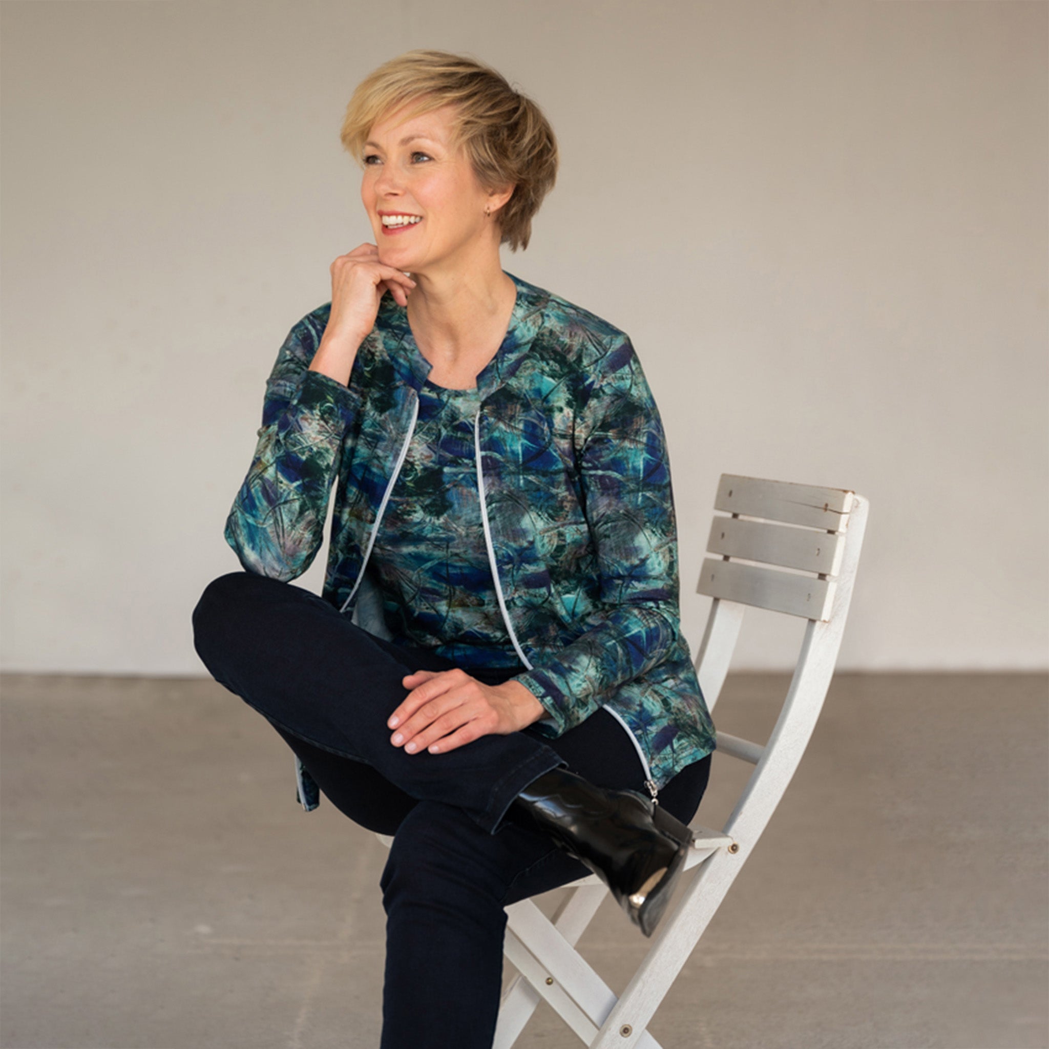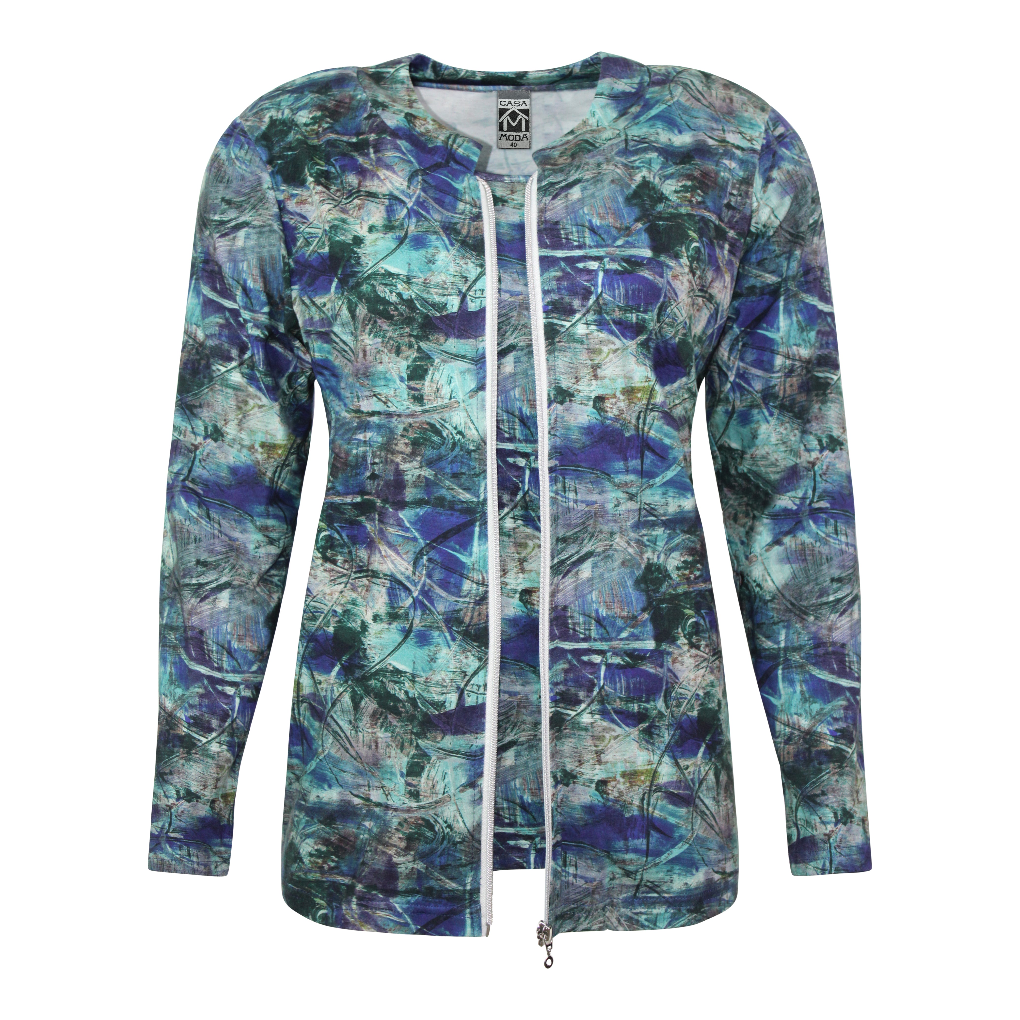 Twinset in een dessin met frisse najaars kleuren. Het twinset bestaat uit een vest en een bijpassend shirt met korte mouwen. Het twinset heeft een ronde halslijn met boordje en ritssluiting. Het geheel is uitgevoerd in een recht model en voelt soepel en zacht aan, wat zorgt voor een prettig draagcomfort.