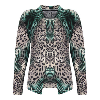 Klassiek twinset uitgevoerd in all over dierenprint met een kleurencombinatie van flessen groen, beige zwart tinten. Het vest heeft geen sluiting en heeft een licht aansluitend model met lange mouwen. Het bijpassende shirt heeft een ronde halslijn en korte mouwen. Het geheel is mooi te combineren op een zwarte of groene rok of broek wat zorgt voor een complete look. De twinset is gemaakt van een winterse jersey kwaliteit met optimaal draagcomfort.