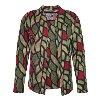 Klassiek twinset uitgevoerd in all over geometrische print met een kleurencombinatie van olijf en rood tinten. Het vest heeft geen sluiting en heeft een licht aansluitend model met lange mouwen. Het bijpassende shirt heeft een ronde halslijn en korte mouwen. Het geheel is mooi te combineren op een zwarte of groene rok of broek wat zorgt voor een complete look. De twinset is gemaakt van een winterse jersey kwaliteit met optimaal draagcomfort.