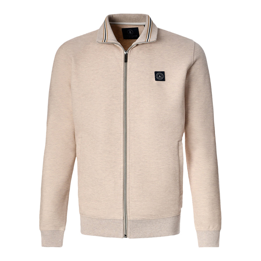 Casual uni vest met opengewerkt gaatjespatroon in een lichte zand tint. Voorzien van een brede kraag met subtiele streepdetails in zwart, beige en wit. Het rechte model heeft lange mouwen met comfortabele tricot boorden en een praktische ritssluiting. Gemaakt van een soepele, behaaglijke jersey kwaliteit. Ook verkrijgbaar in een olijf groene kleur.