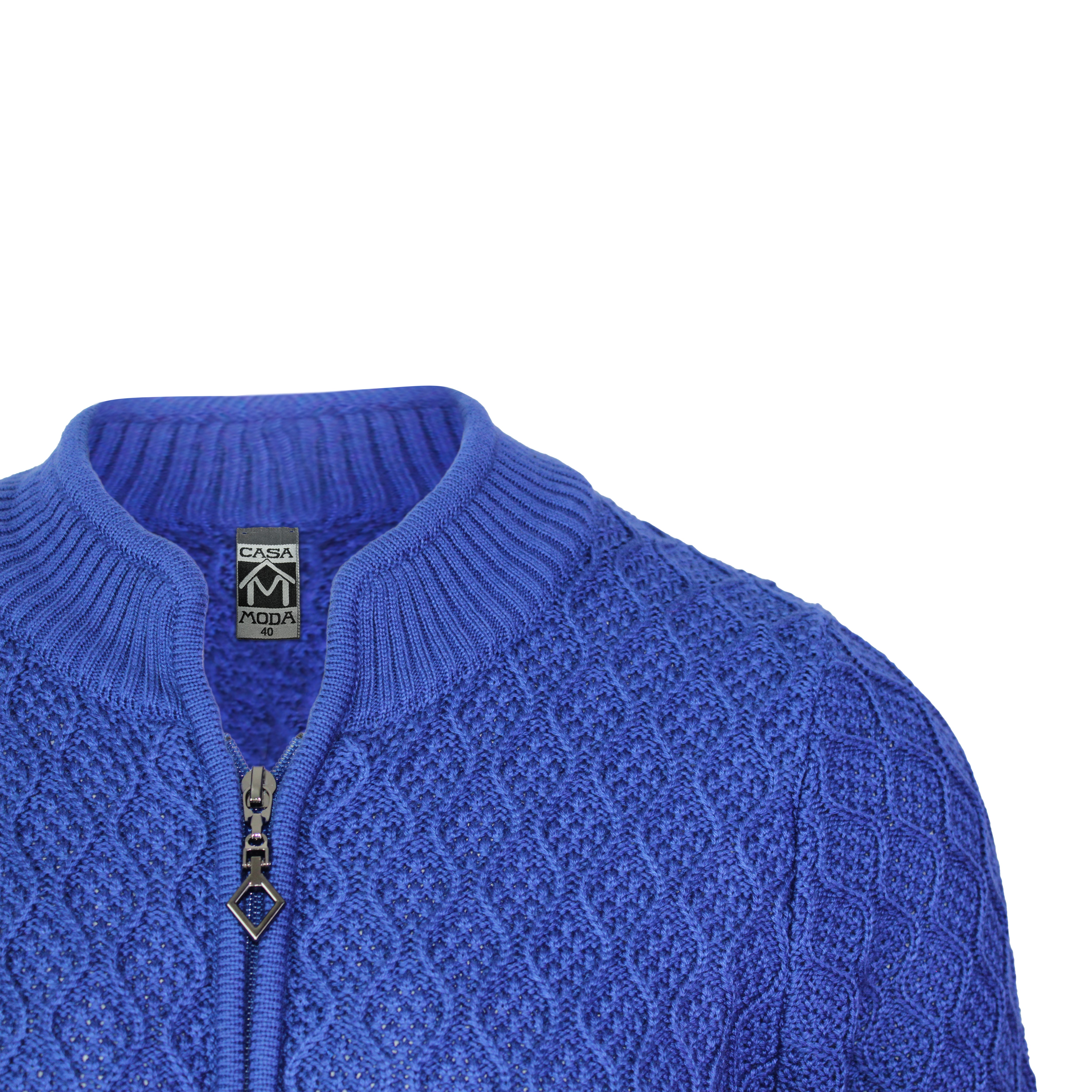 Dit cobalt blauwe vest combineert comfort en stijl in één. Het is uitgevoerd in een all-over wyber patroon, wat het een rijke en moderne uitstraling geeft. De opstaande boord en de brede manchetten en onderboord zorgen voor een perfecte pasvorm en een sportief-chique look. Dankzij de hoogwaardige afwerking en de levendige kobalt kleur is dit een echte blikvanger in iedere garderobe.