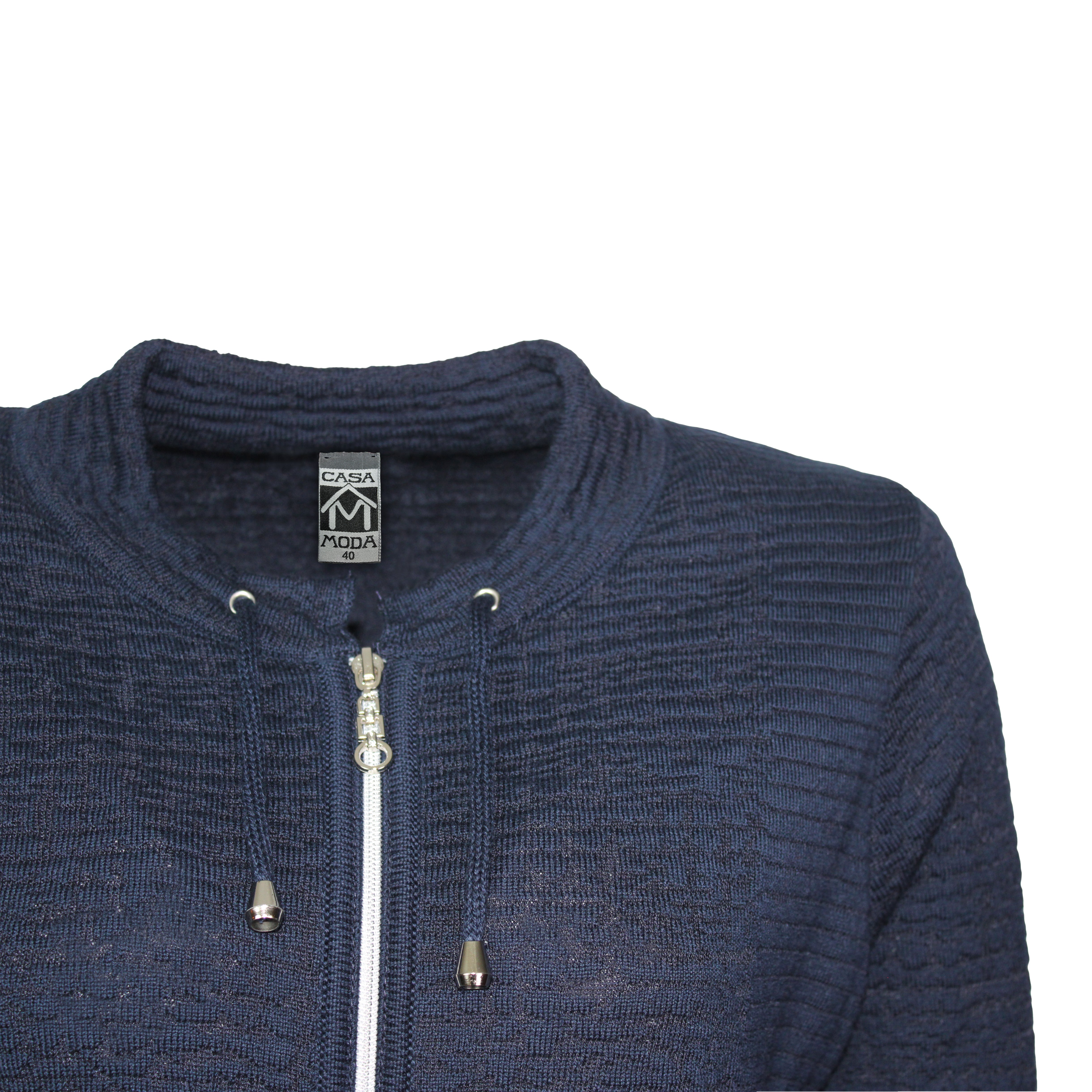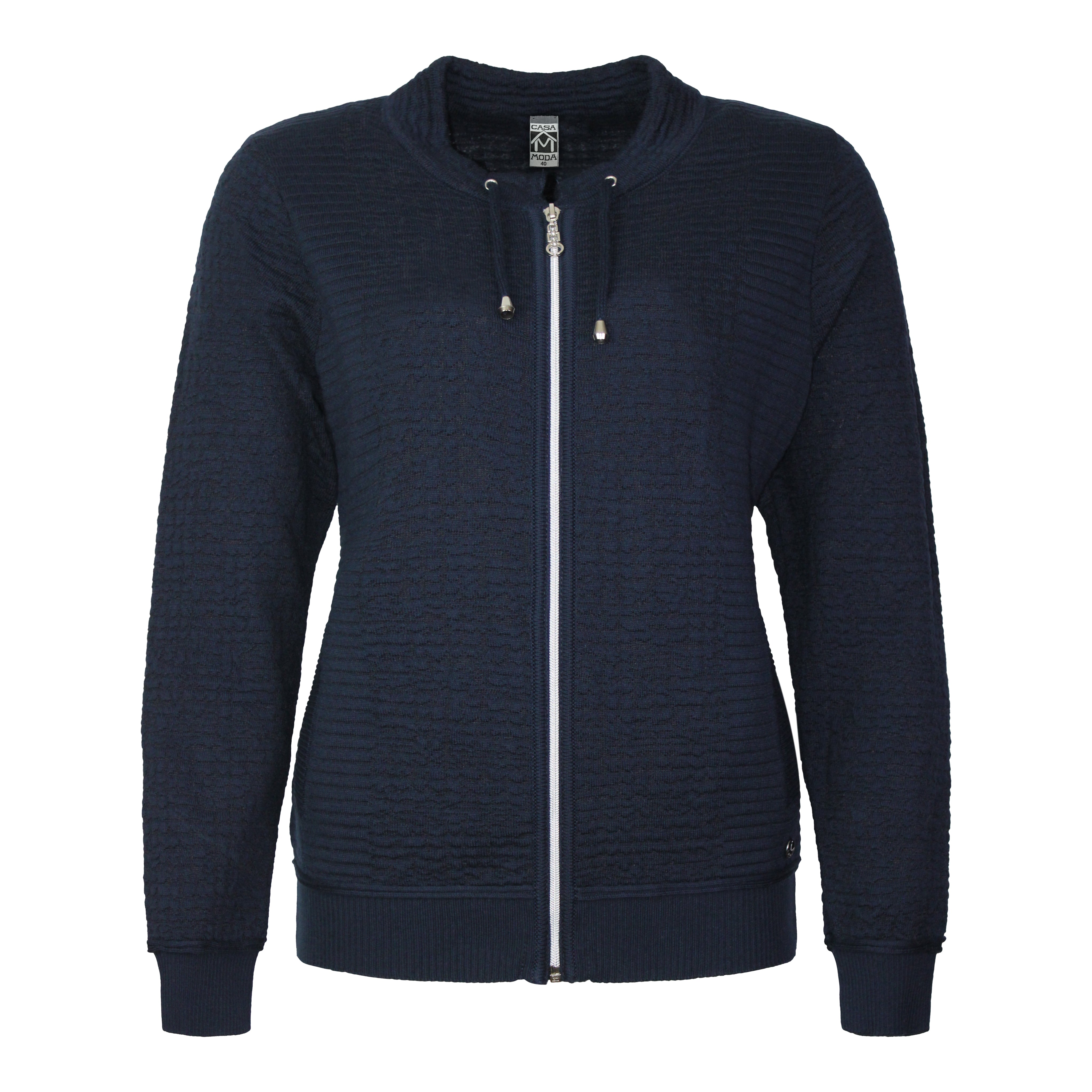 Marine vest met subtiele reliëfstructuur. Voorzien van ritssluiting, opstaand boordje met koordje, manchetten en brede onderboord. Gemaakt van zachte, soepele elastische jerseykwaliteit voor optimaal draagcomfort. Makkelijk te combineren en perfect voor dagelijks gebruik.