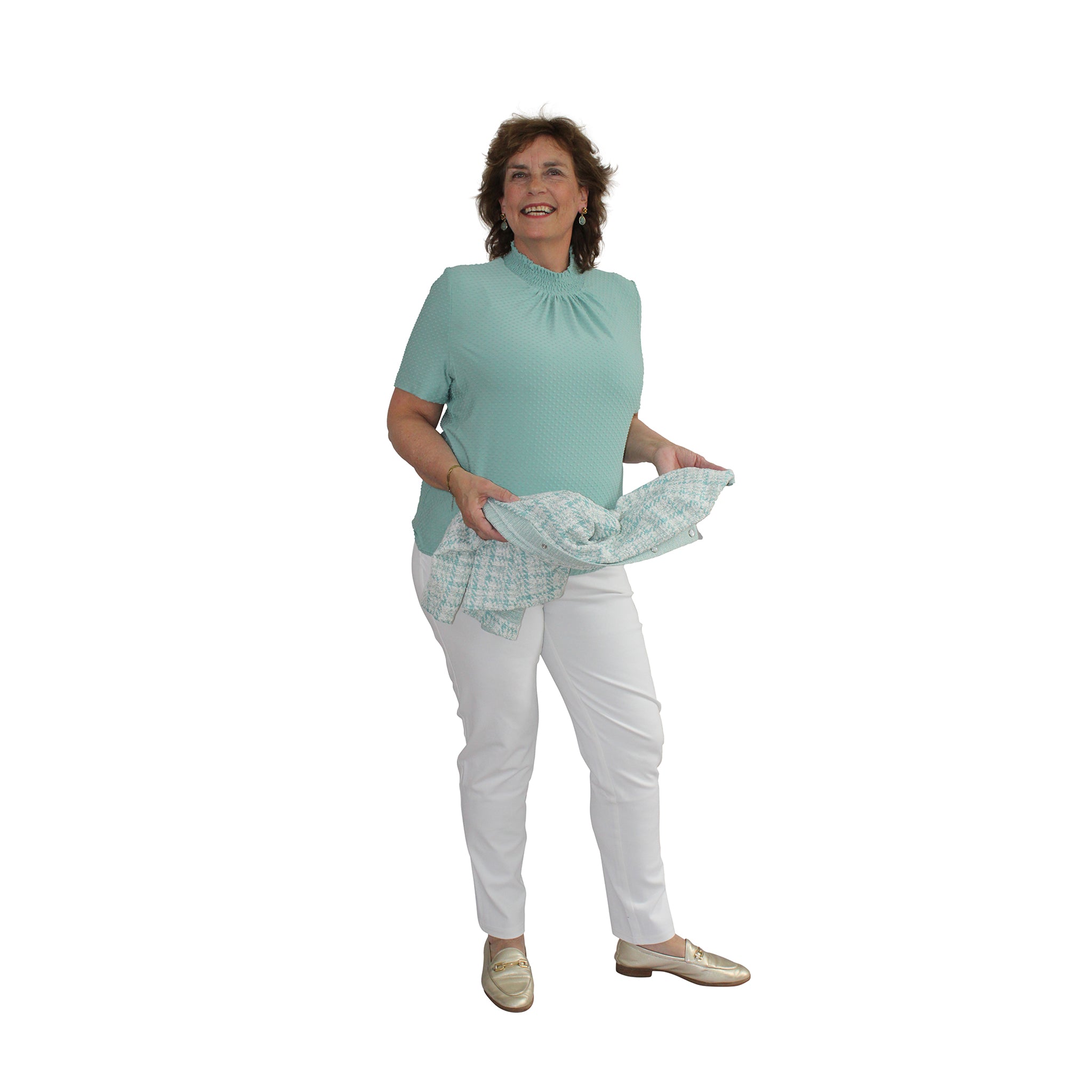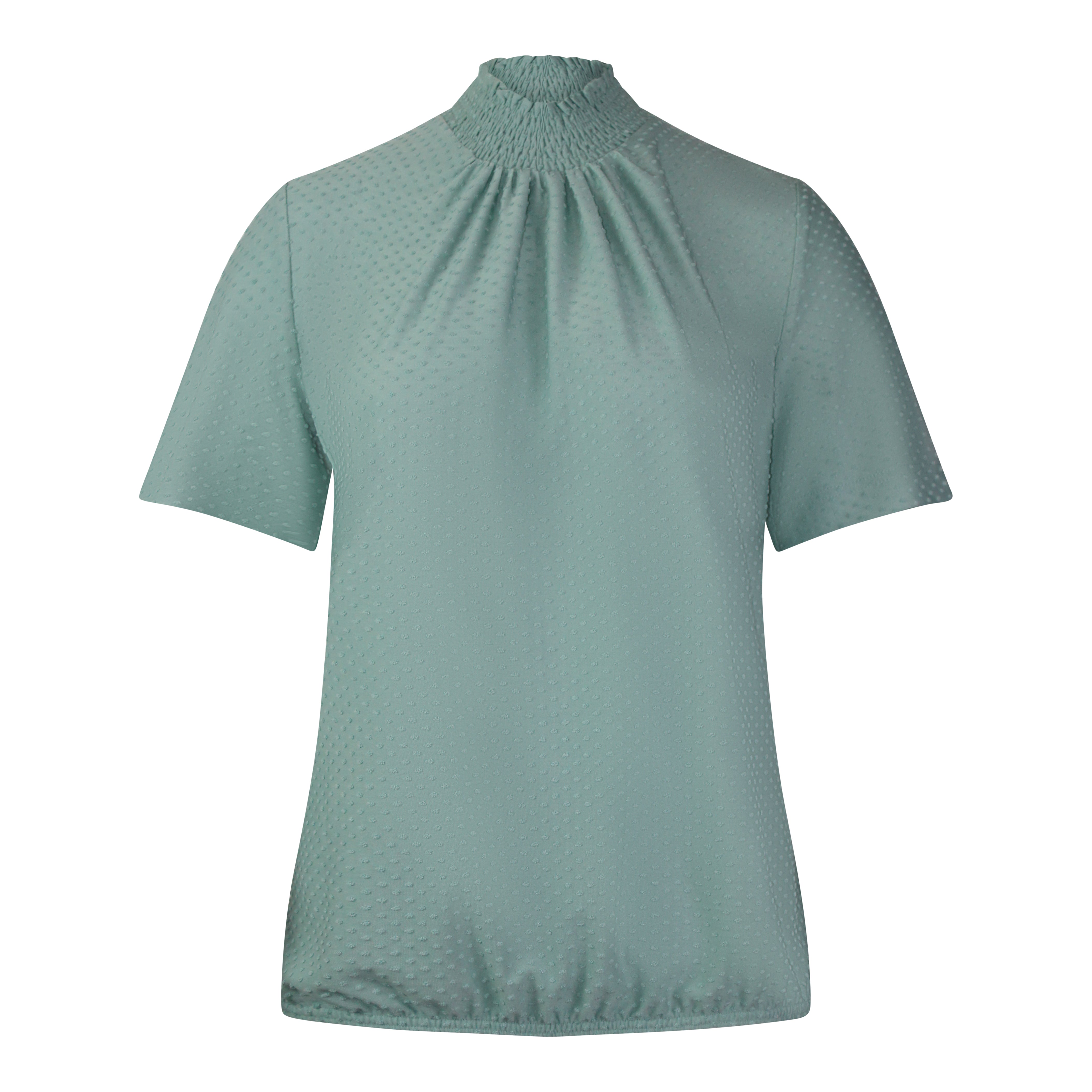 Deze blouson met speels bolletjesdessin in een zachte emerald tint is een echte blikvanger. De gesmokte elastische col en korte mouwen geven het model een vrouwelijke en comfortabele pasvorm. Het subtiele geschubde detail aan de voorkant zorgt voor een charmante, luchtige uitstraling. Makkelijk te combineren en perfect om je outfit net dat beetje extra te geven. Ook verkrijgbaar in wolwit