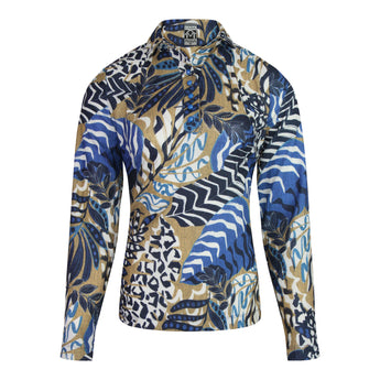 Rijk uitgevoerd poloshirt in een najaarsdessin met een kleurencombinatie van blauw en caramel tinten. Het poloshirt heeft een ruime kraag en polosluiting met sierlijke bijpassende knoopjes. Het poloshirt heef een recht model en lange mouwen en heeft een prettig draagcomfort